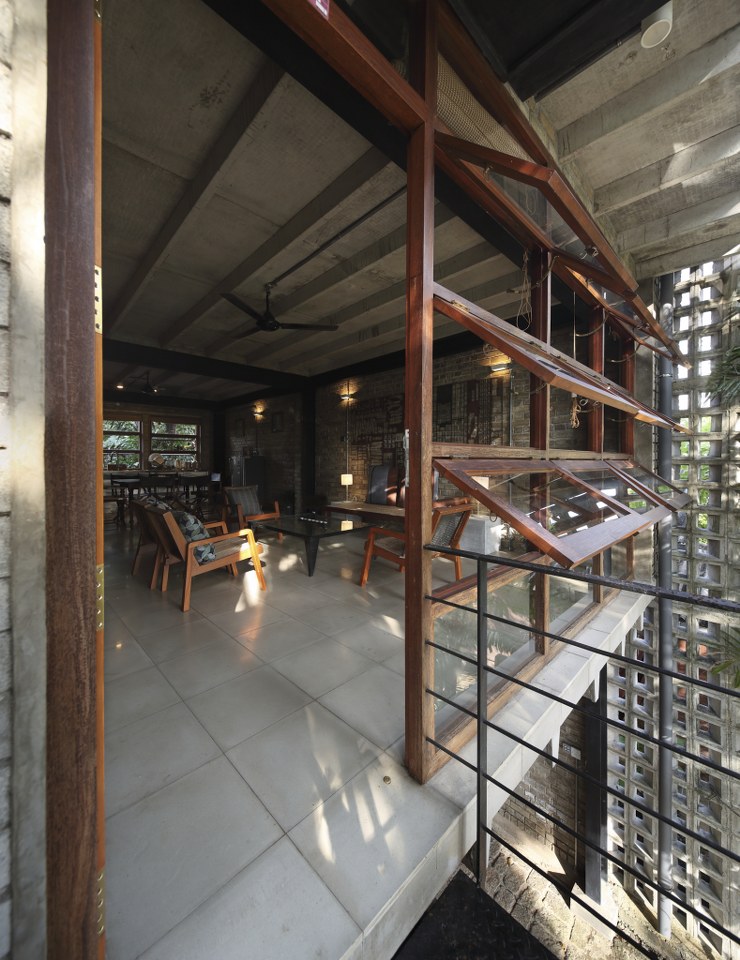 The external materials possess rich texture and timelessness, with the primary goal of being a thoughtful balance between solid and void. This enhances the beauty of the exposed brick masonry, particularly around openings. For instance, cement louver grill blockwork envelops the cantilevered upper-floor balconies, softening the harsh tropical sunlight and shielding them from monsoonal downpours.