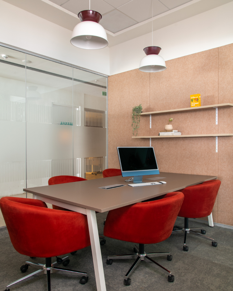 The overall palette is gentle yet vibrant, echoing the brand’s essence in every detail—from acoustic panels to glass writing boards, from playful accent lights to earthy furniture.