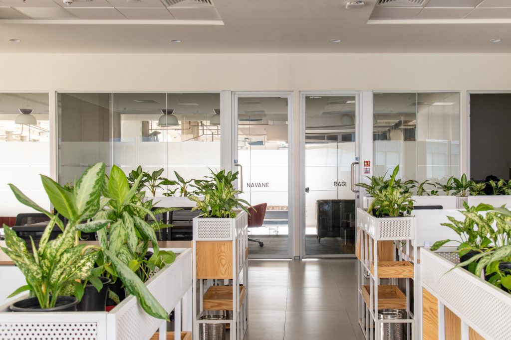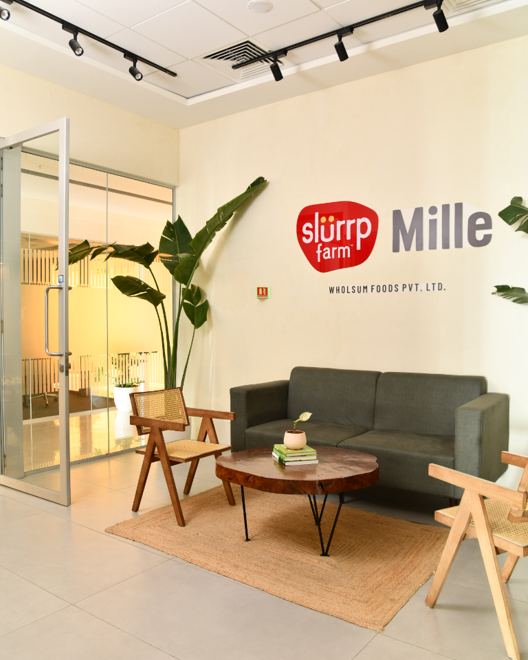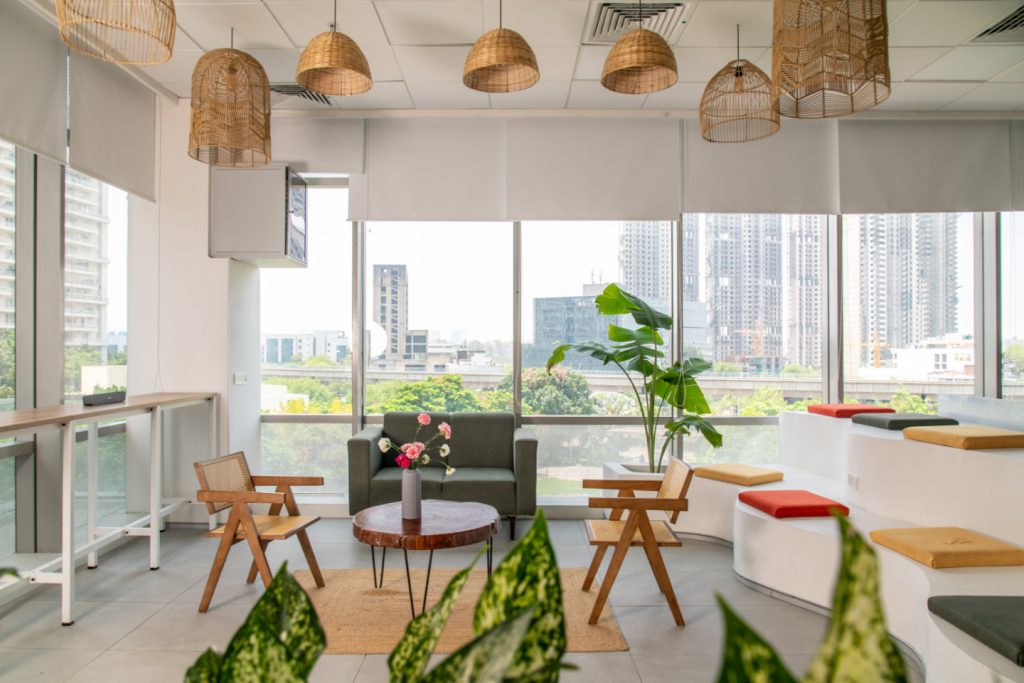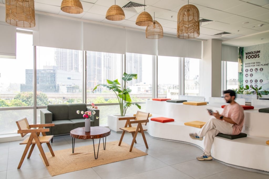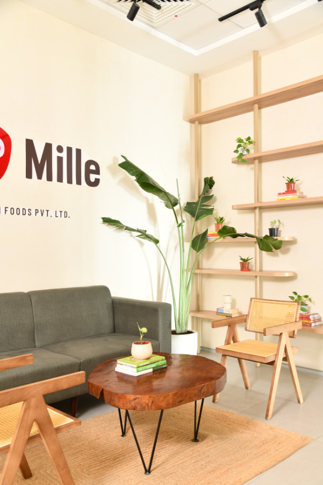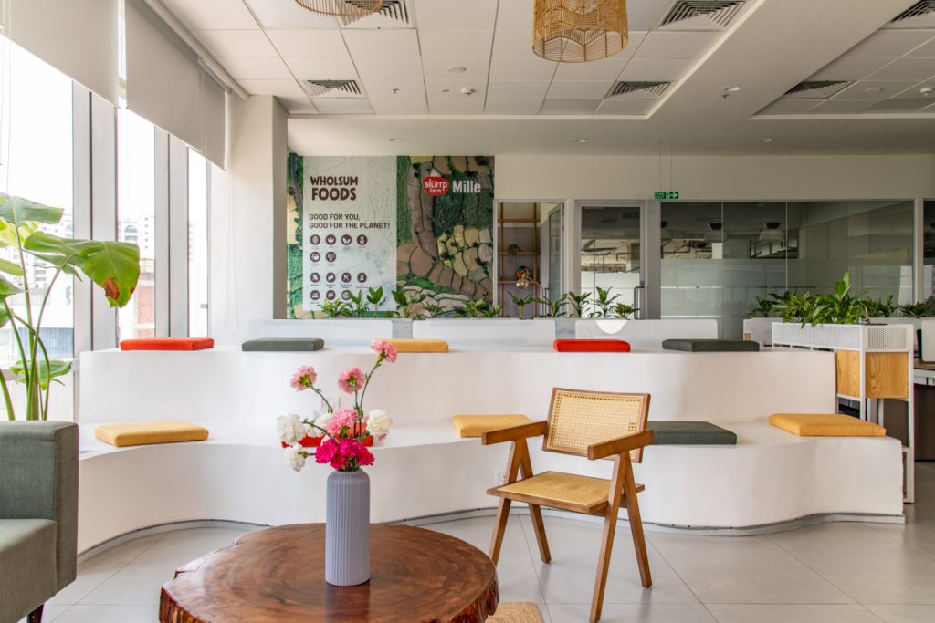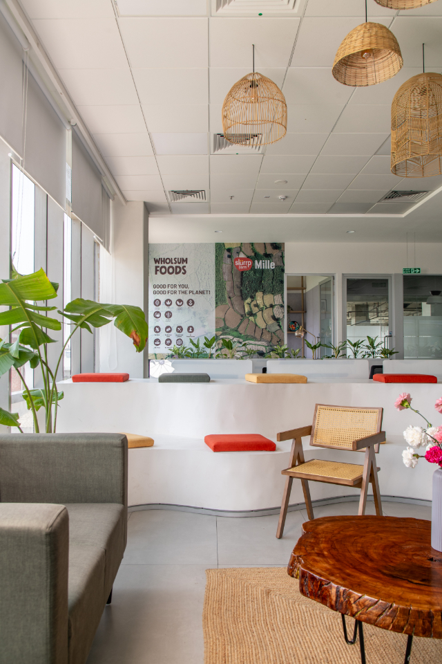 Meeting rooms named after millets and grains celebrate sustainability, while materials like rattan, jute, wood, and plants infuse the space with natural warmth.
