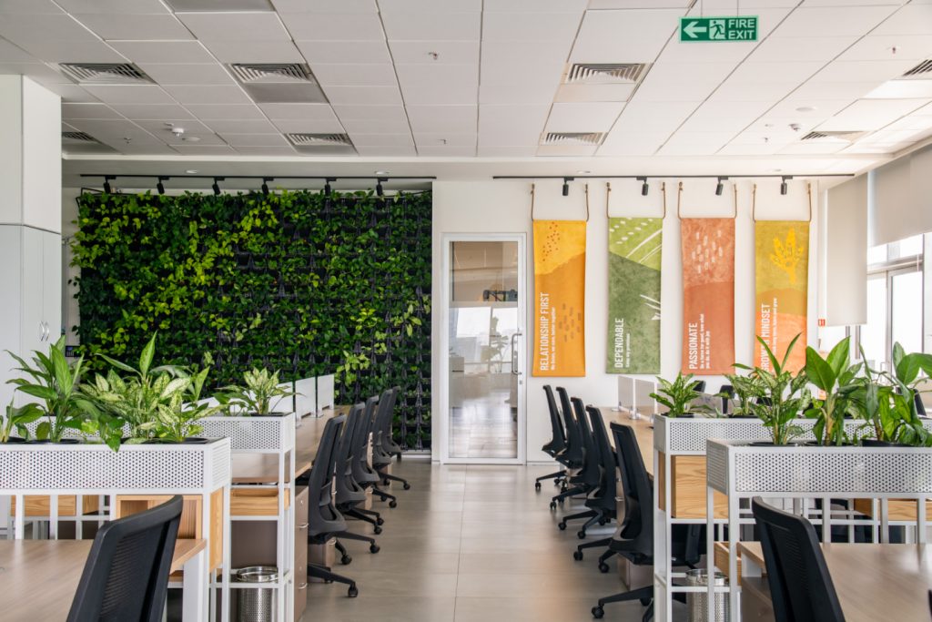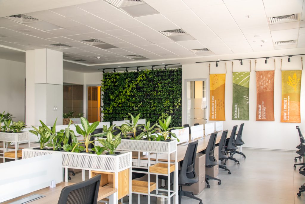 Nature’s vitality flows throughout the office; a towering plant wall breathes freshness, bringing the outdoors inside and uplifting spirits.