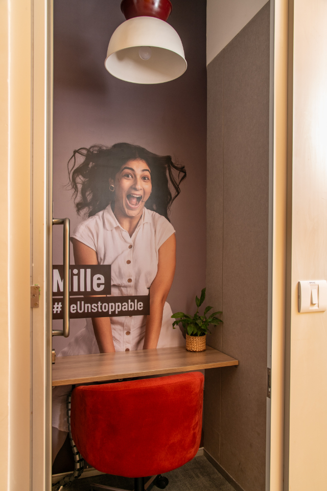 Quirky, cheerful phone booths offer bright retreats for solo focus, sparking a sense of playful possibility. Aptly cladded with acoustic panels and concealed for making these sound proof