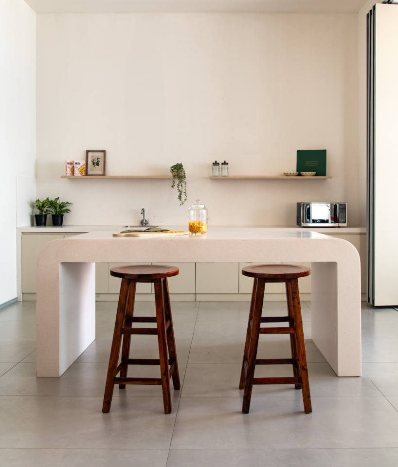 The pristine Corian island counter acts as a buzzing hub for cooking, collaboration, and spontaneous evening teas.