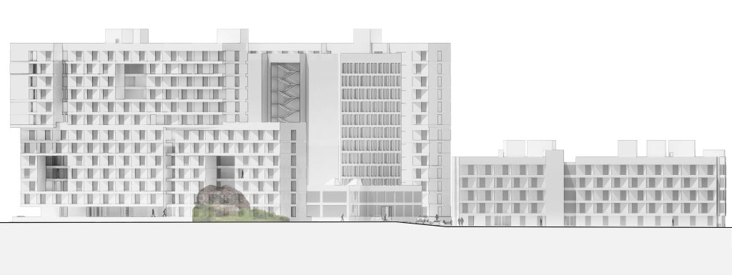 During excavation, a boulder surfaced—not an obstacle but a provocation, stubborn and immovable. It remains, integrated into the masterplan, a monolith to which architecture must respond rather than erase. The rock now forms a gateway to the project, a timeless contrast to the newly risen concrete geology, a reminder of permanence amidst change.