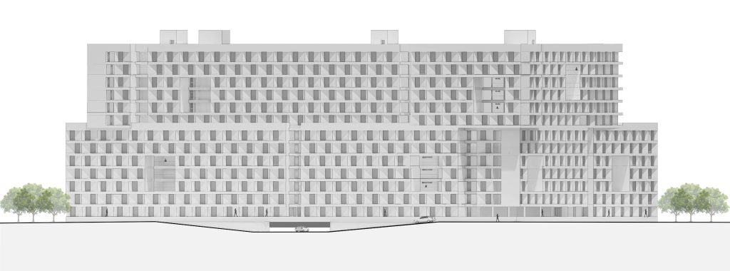 Double- and triple-height cutouts punctuate the student residential volumes, acting as meeting places suspended in air. These sky lounges not only offer panoramic views of the campus and its surroundings but also become social condensers. Students encounter one another not in corridors but in vertical apertures, suspended meeting spaces that overlook the courtyard and the landscape beyond.