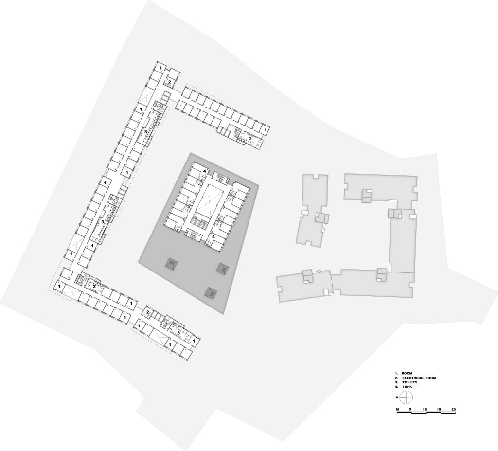 The student housing buildings orbit the perimeter of the site, enclosing a courtyard. At its center, is the common facilities podium, a communal anchor, a social space—dining Hall, multipurpose rooms, TV lounge, all tied together by a vertical housing tower comprising of faculty studio apartments. The valley of the peripheral built and central mass is occupied by sports facilities. The architectural move is strategic — framing social life inward while engaging the larger landscape outward.