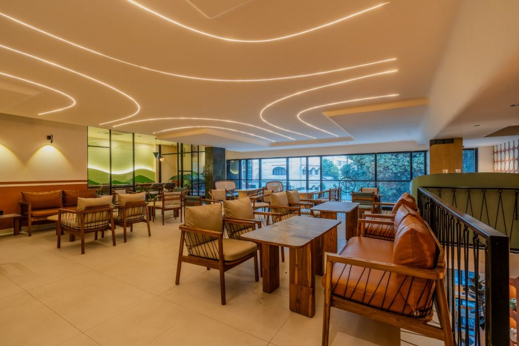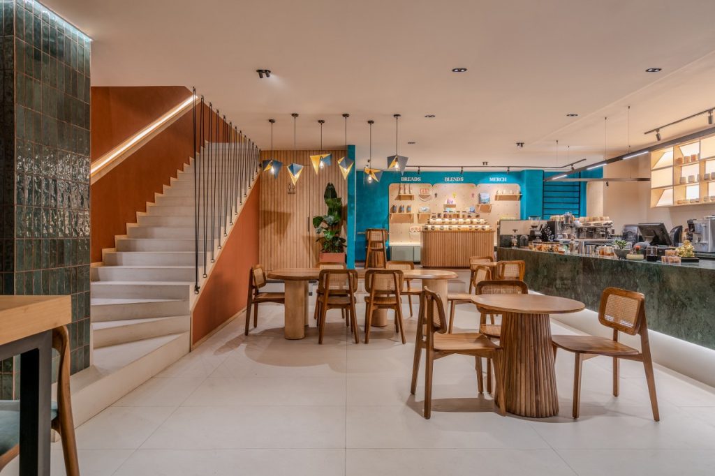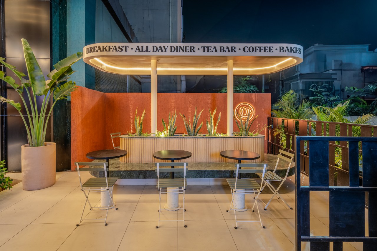 The wall accents within the space are fluted panels. This project not only covers the interior and exterior design of the cafeteria but also houses the product design done and executed to fit within the idealised concept. Every single piece of furniture and lighting has been designed to blend with the feel factor of the space and radiate the perfect amount of light in the perfect sense.