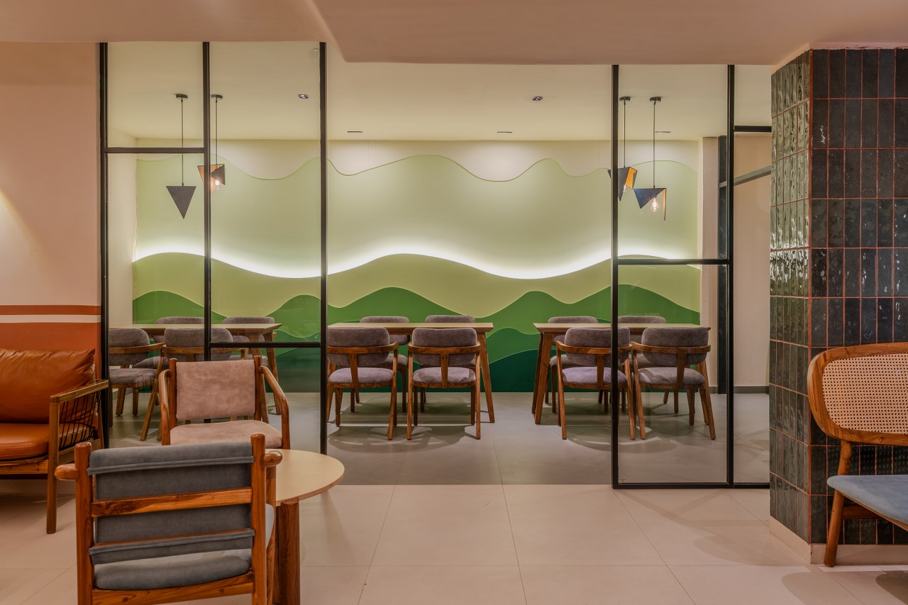 Products/Materials/Vendors: Paint – Asian paintm / Texture paint – Oikos / Construction Materials – Mild Steel metal, Tile, Backlit stretch fabric, panelling Wooden furniture / Wallcovering / Cladding – Green marble cladding, customized wall art / Doors and Partitions – Fluted panels / Sanitaryware – Kohler / Furniture – Wood and metal furniture. / Flooring –, Terrazzo flooring and tile.