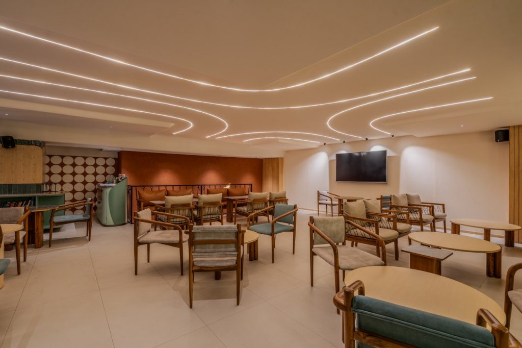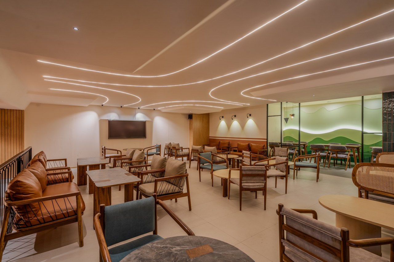 The mezzanine floor has the maximum seating capacity of the space with a low-height plain ceiling which has a curved profile light and walls in wooden beading with company theme branding. This floor has a dedicated PDR area for small gatherings.