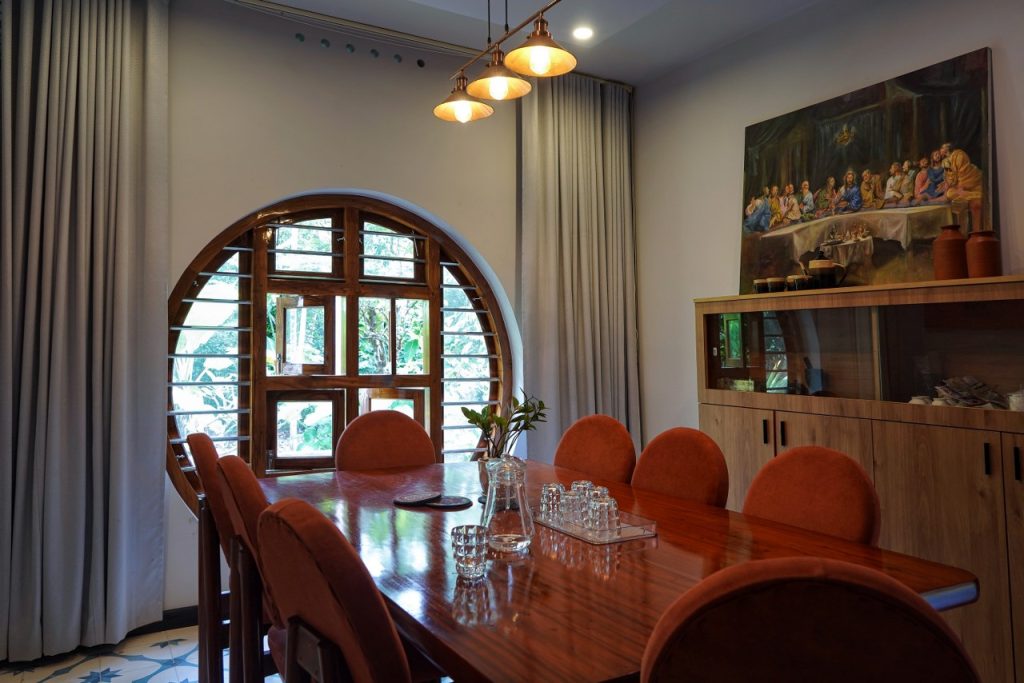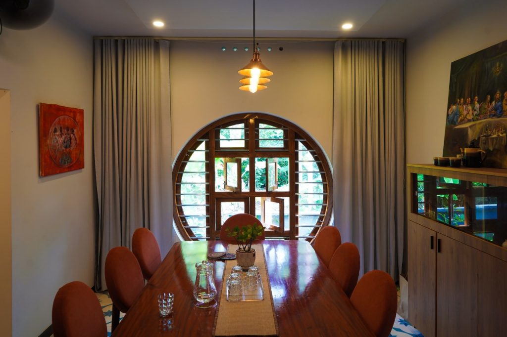 Anchored by a striking round window that frames the lush landscape, the dining area blurs the line between interior and nature. Soft daylight filters through the wooden grid, enriching the warm tones of the furniture and finishes, while the elegant pendant lights add a subtle glow.