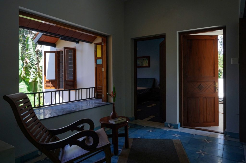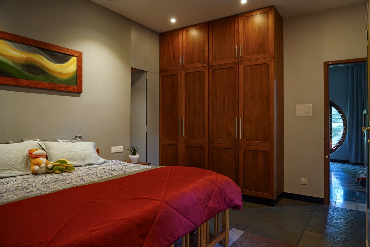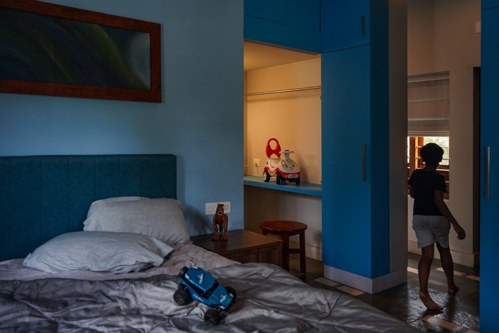 The bedroom overlooks the front yard, with wooden shutter windows that reduce heat gain and frame serene outdoor views. The blue tone, inspired by the Athangudi inlays in the Kota stone flooring, ties the space together—creating a cool, cohesive, and tranquil environment.