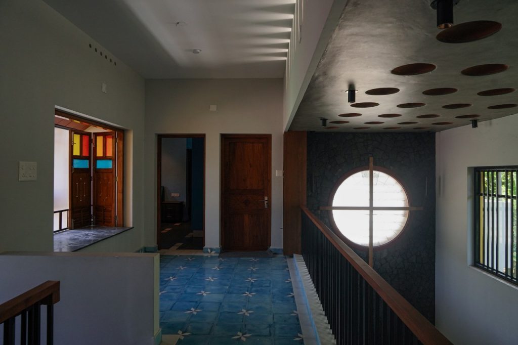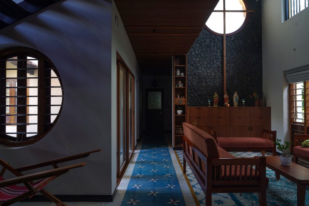 “The design seamlessly blends architecture and landscape, with grass pavers reducing heat and aiding rainwater percolation. A stone wall and round window connect interior and exterior, while shaded parking with a tiled roof, tropical vegetation, and subtle level changes create a serene, climate-responsive setting inspired by Kerala’s vernacular charm.”