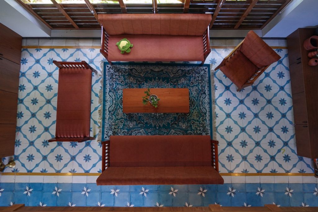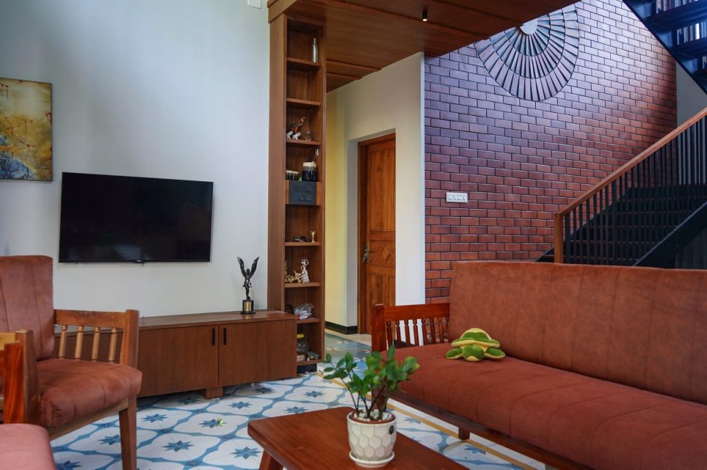 The Athangudi handmade tile flooring lends artisanal elegance, complemented by teak wood masonry and brick cladding that add warmth and texture. The composition reflects a seamless interplay of tradition, materiality, and light.