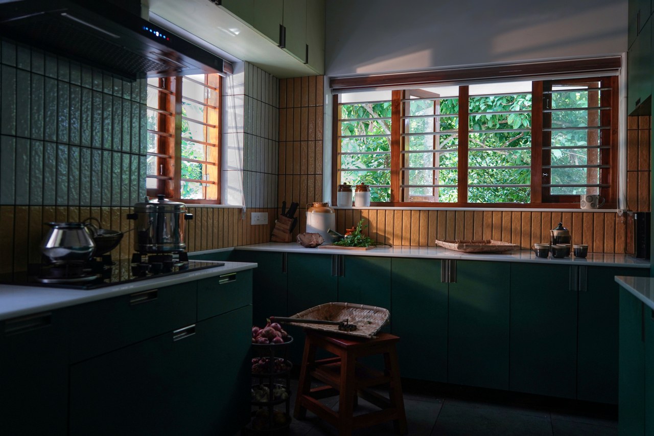 Flooded with soft natural light, the kitchen captures the essence of calm functionality. The large wooden-framed windows open to lush greenery, creating a refreshing connection to the outdoors while ensuring ample ventilation. Warm vertical tiles complement the deep green cabinetry, balancing texture and tone. The interplay of light, material, and earthy hues transforms this everyday space into an inviting, sensory experience—where nature and design coexist effortlessly.