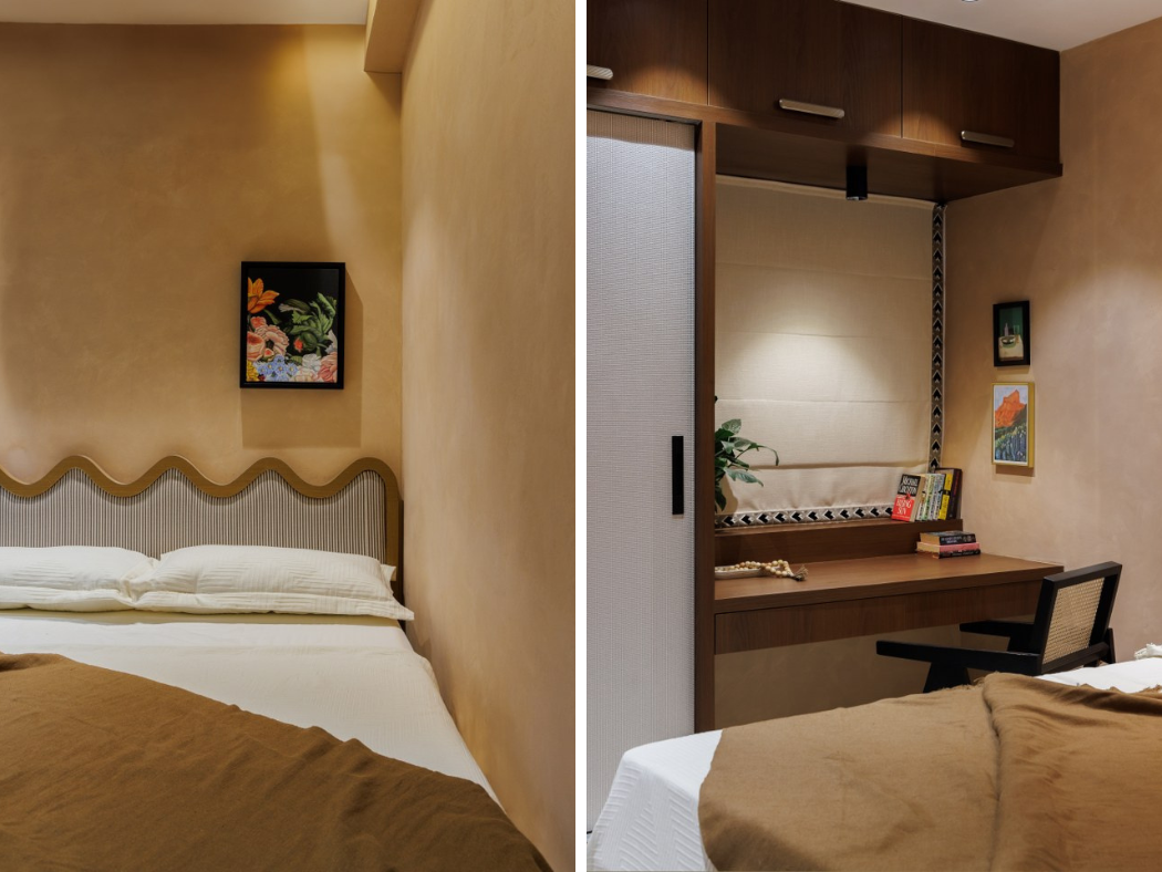 Color was always emotional, not decorative. Bedrooms get rust shades grounded and warm. Kitchens and cabinetry have sage-green tones that settle the space. Shared areas remain in creamy neutrals and soft tones so the eye can rest. Small accents punctuate the calm, giving identity without shouting.