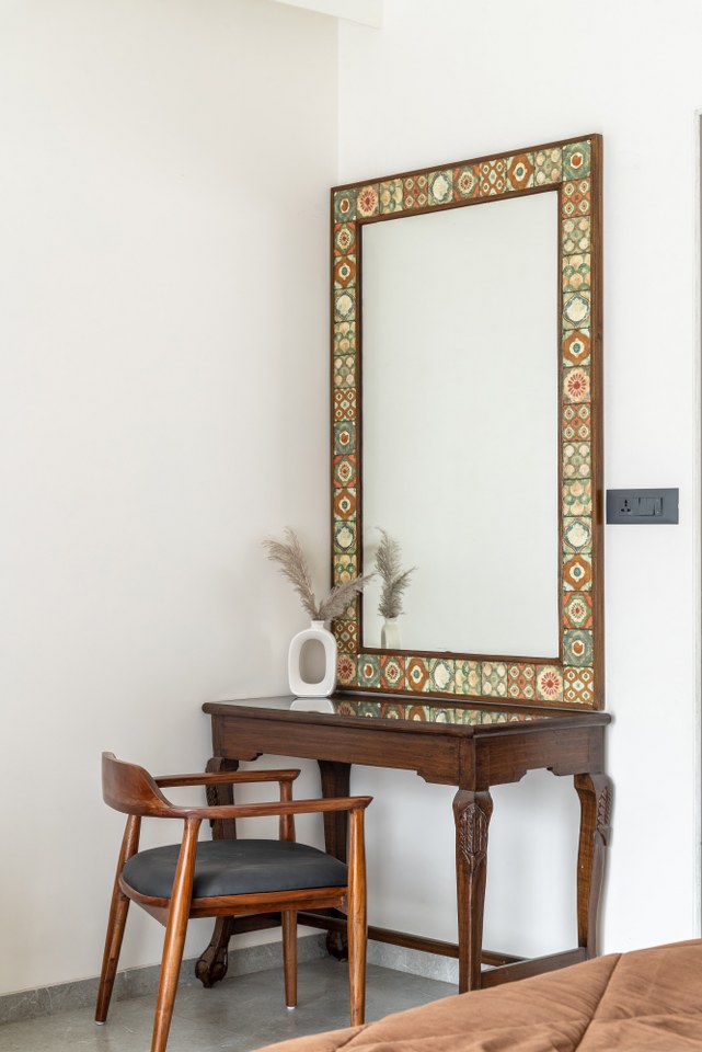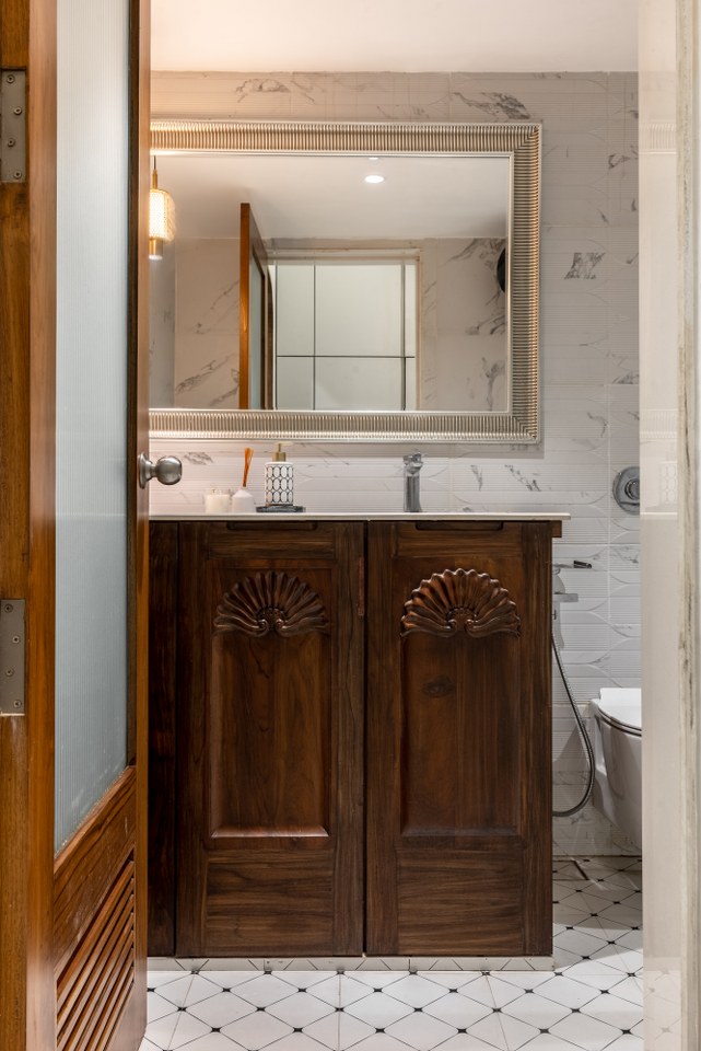 There is a timeless quality in the simplicity—a sense that the home is as much about feeling as it is about looks. At the centre of the design philosophy of this vacation house lies the use of reclaimed teakwood, salvaged from the original 80-year-old building. This wood had quietly witnessed decades of family life, its surfaces showing the subtle marks of time. Instead of discarding it, the design team carefully restored and repurposed the material. The teakwood transformed into custom furniture, cabinetry, mirror frames, and carved accents, allowing fragments of the old home to live on within the new. This thoughtful gesture created not only sustainable design but also a physical and emotional connection between the past and present. Every room was crafted with purpose.