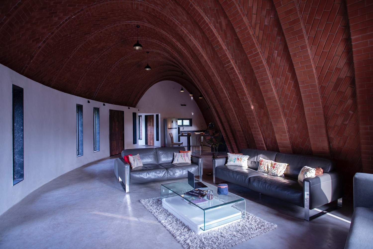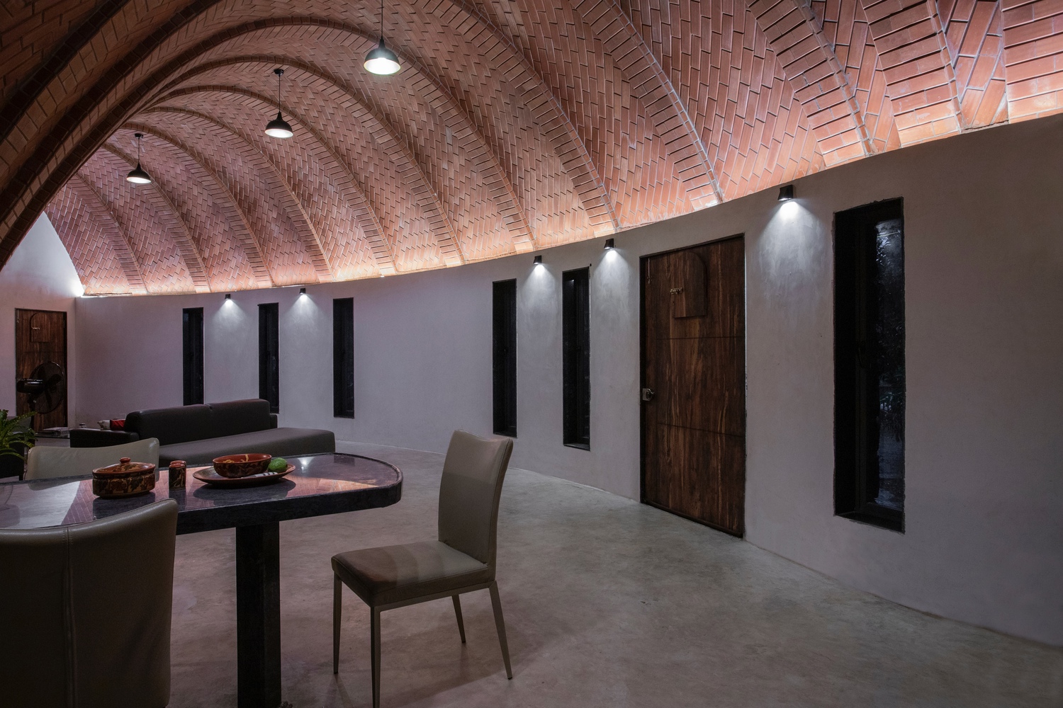 Set on the outskirts of Bharuch, this weekend retreat with a vaulted roof grows out of the land as much as it rests upon it. The plot came with mature fruit-bearing trees like mango (Mangifera indica), chickoo (Manilkara zapota), and jamun (Syzygium cumini), whose presence defined the layout from the very beginning. Rather than clearing the site, the house was conceived as a curving form that gently weaves around the existing canopy, allowing architecture and landscape to remain in dialogue.