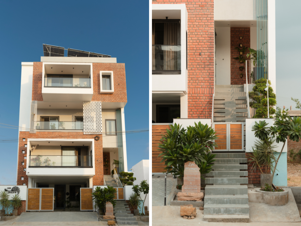 The façade expresses a contemporary residential character through clean volumes, material contrast and layered depth. “Designers combine exposed brick with off-white and grey paint to create a balance of warmth and simplicity, while aluminium glass railings add lightness and visual continuity.” Projected balconies and recessed frames introduce depth and create a subtle play of light and shadow, strengthening the vertical rhythm of the elevation.