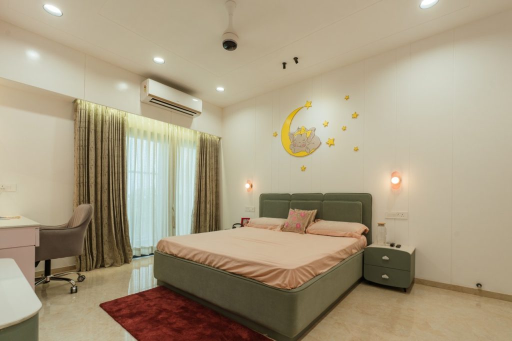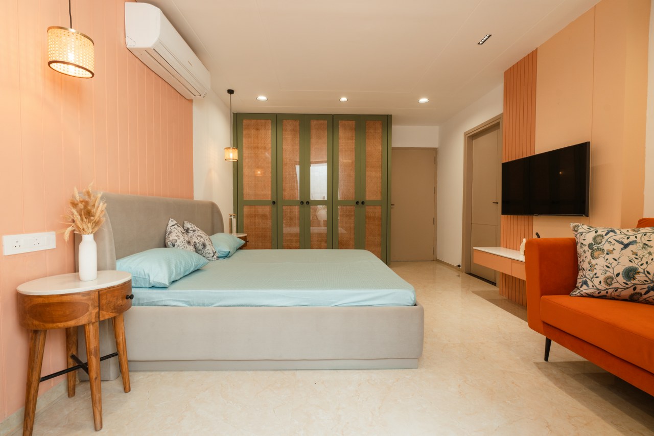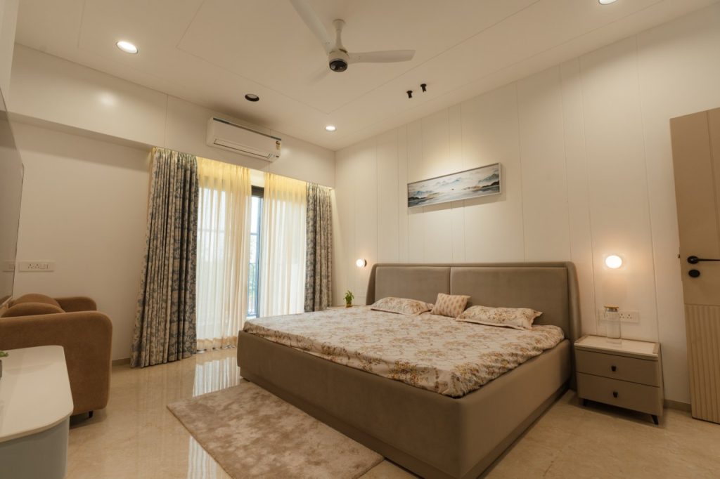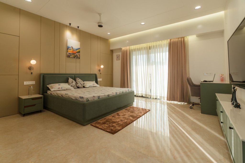 The bedroom is designed with a separate walk-in-wardrobe space and large openings for natural light and ventilation, supported by an attached toilet, further room extends into a balcony with panoramic views.