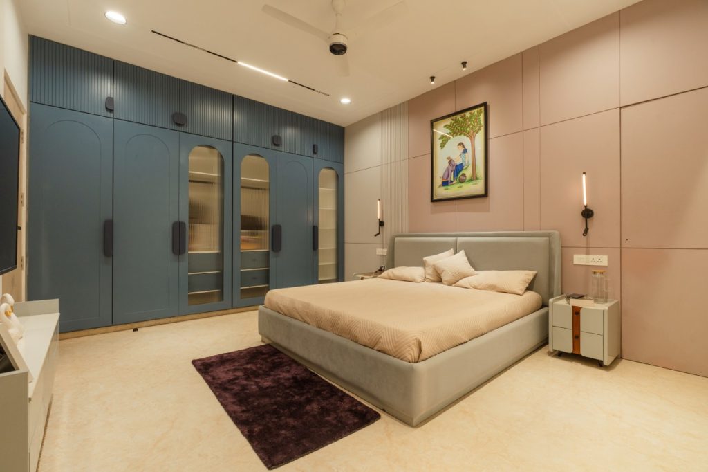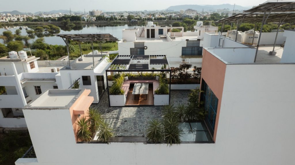 Located in Udaipur– Rajasthan, this residential project enjoys a unique setting with panoramic views of Roop Sagar on one side and surrounding hills on the remaining three sides. The design brief focused on creating a modern and minimalist residence that exudes serenity and understated luxury. “The designers thoughtfully planned the house to include premium lifestyle amenities such as a home theatre, bar lounge, terrace garden, and private balconies, along with dedicated open spaces for every room.” A key client requirement was to create an open and breathable home, ensuring ample natural light and cross-ventilation so that every space remains well-lit, airy and seamlessly connected to its surroundings.