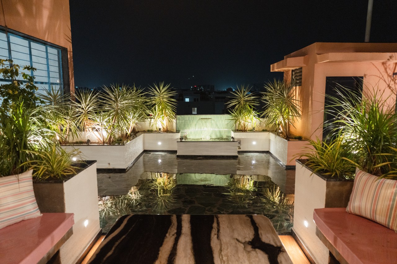 The remaining area is developed as an open terrace envisioned as an extension of the living spaces. Integrated with generous landscaping and a water body, the terrace creates a calm microclimate while enhancing visual and experiential quality. Designed to accommodate outdoor seating and recreational activities, the space remains flexible for future adaptations such as social gatherings, wellness activities or additional landscape interventions, reinforcing the overall indoor–outdoor living concept of the residence.