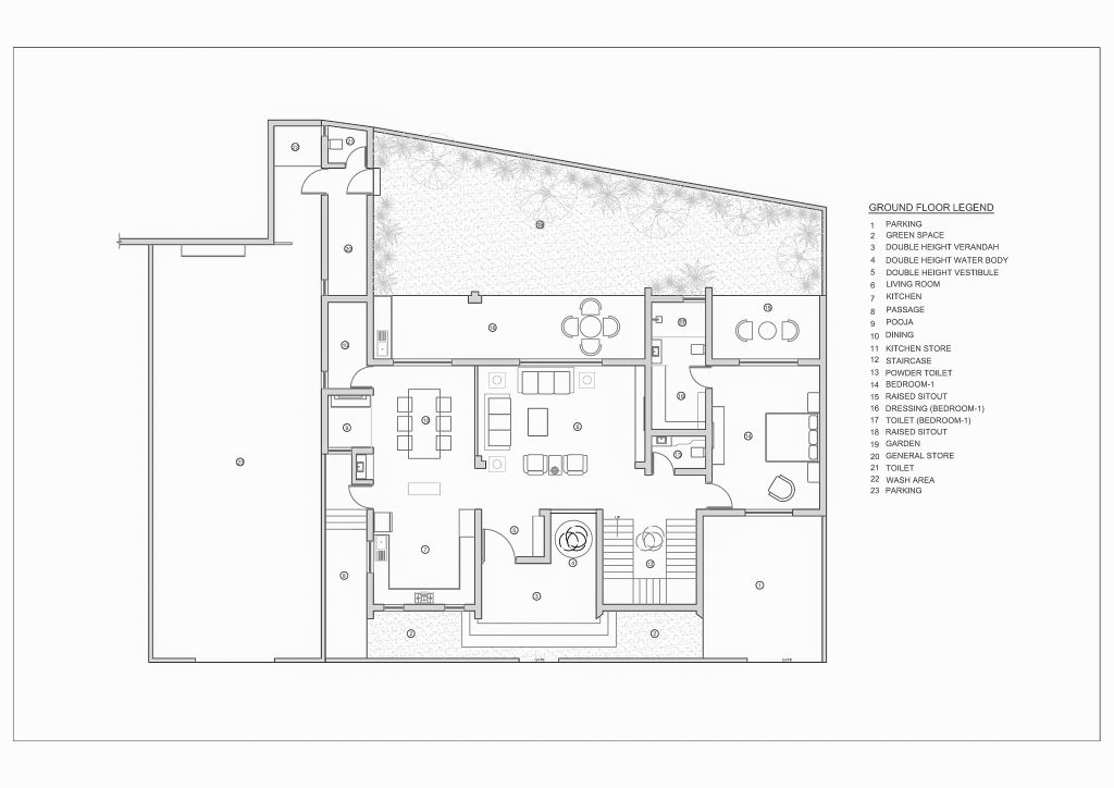 Located in HMT Layout, Bangalore, Isha_Srinidhi Nilaya stands as a multi-generational home designed on a compact 60×40 ft (2400 sq. ft) East facing plot, with a total built-up area of 8000 sq. ft. East Facing a lush public park, the residence responds to its urban setting through a layered design that balances privacy with a […]