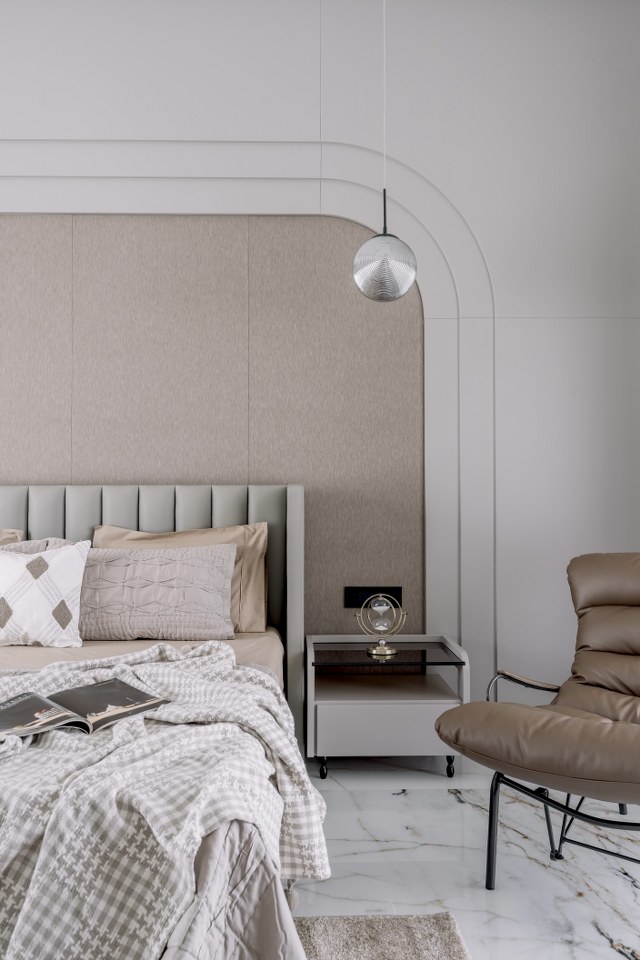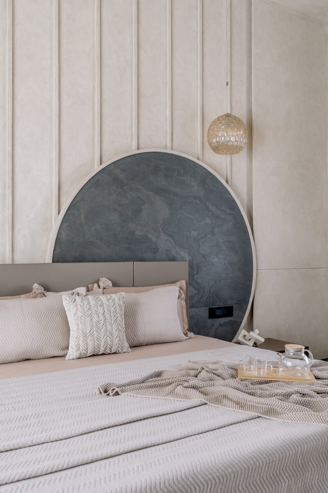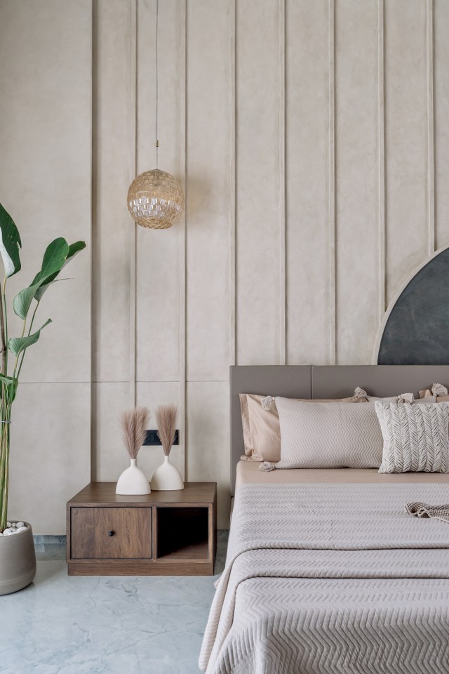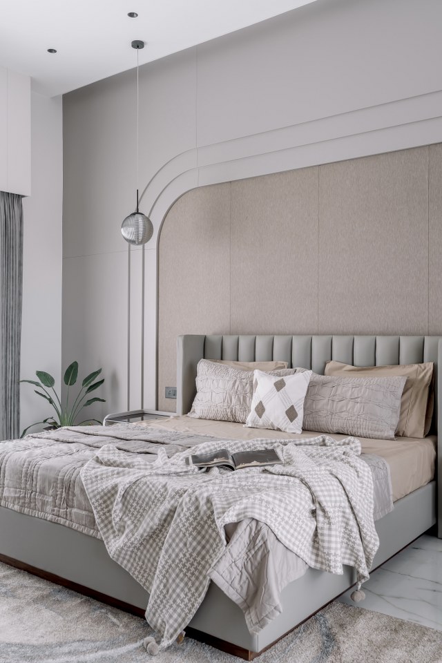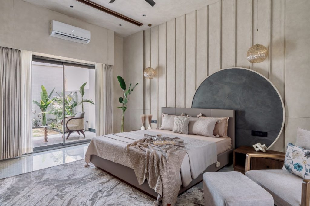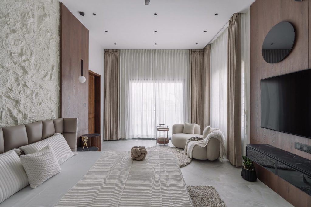 The parents’ bedroom showcases exceptional planning with dual balcony access on both east and west orientations, ensuring optimal cross-ventilation and natural light throughout the day despite the west-facing plot challenges. The curved headboard wall treatment creates an intimate cocoon-like environment, while warm beige and gray palettes promote relaxation. This dual-balcony configuration provides flexibility for morning and evening outdoor activities while mitigating heat gain through strategic shading.
