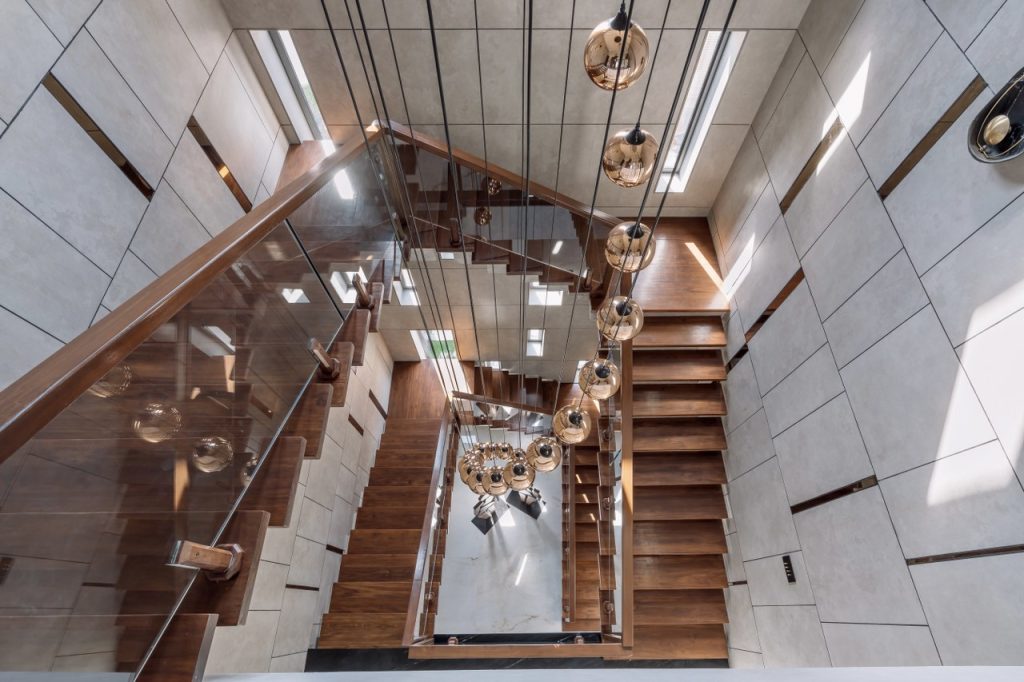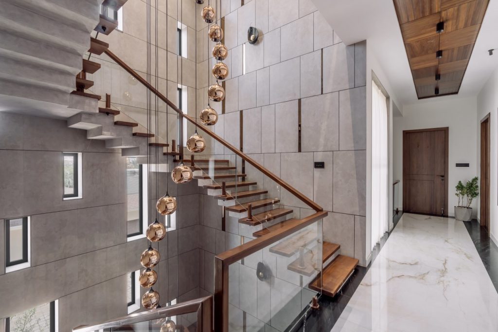 The floating concrete staircase becomes a central sculptural element, incorporating 9-inch hanging wooden elements on both sides while strategic perforations create dynamic shadow play, transforming natural light into architectural poetry.