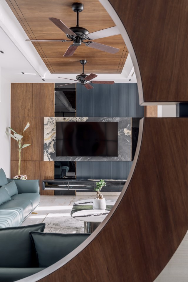 The innovative circular opening within the dining-living partition creates visual connection while enabling television viewing from multiple positions.