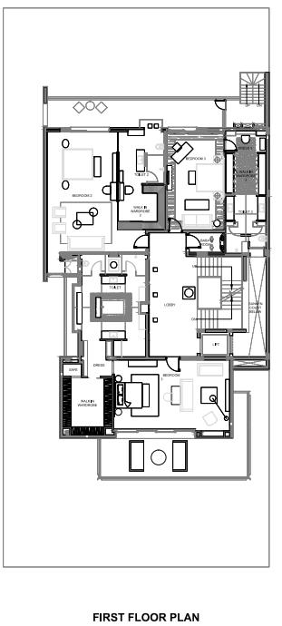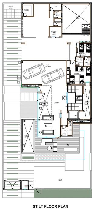 This prepossessing expanse also incorporates an elegant waiting area facing towards the front garden. Services including electrical, Genset & UPS rooms, laundry cum ironing room, and servant block are also planned at the rear of the stilt floor so that there occurs no jeopardy with the privacy of the users. A service staircase is tailored here in order to bring in the hospitality design concept where housekeeping, maintenance, and other services are segregated from the main entry.