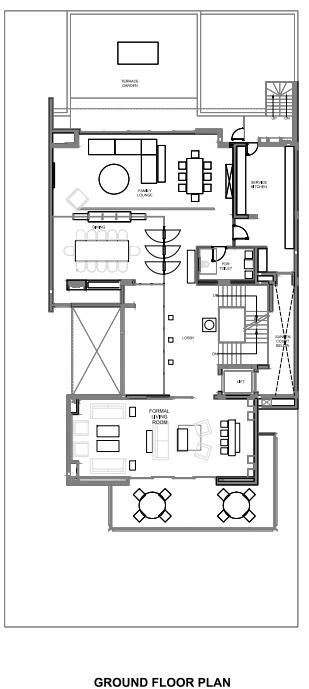Moving towards the ground floor, the layout comprises of living area, a formal drawing room, family lounge with kitchen, dining and powder room. Inspired by the hospitality design concept, the kitchen is connected to the service staircase granting privacy to the residents. Meandering with the design towards the first floor which constitutes three magnificent bedrooms with attached toilets and walk-in closets. The second floor embodies a master bedroom, a kids room and a lounge. The floor possesses a connotation of a pellucid view of the terrace garden from the lounge and the room, both through glass façade.
