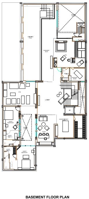 The basement while forming a perfect air for partying and rejuvenating acquires two guest bedrooms, a spectacular pool, spa and a gymnasium, bestowing a sense of gratification. Two sunken gardens smartly engineered here ensure ample ventilation and natural light for pool and spa at the rear and bedrooms and gym at the front