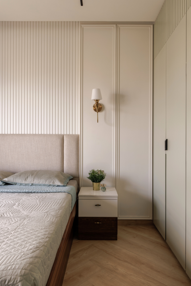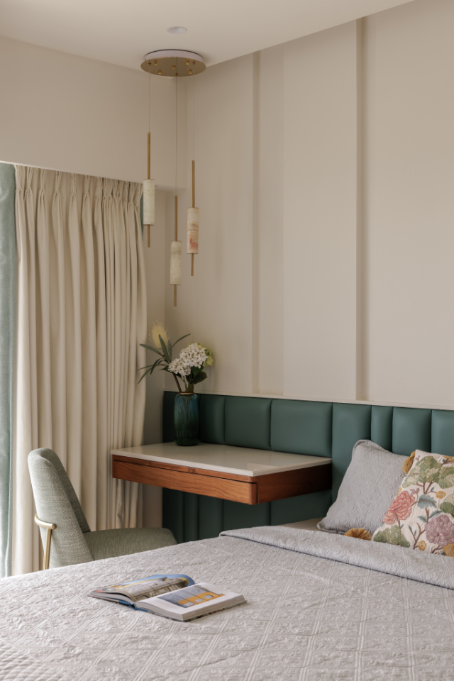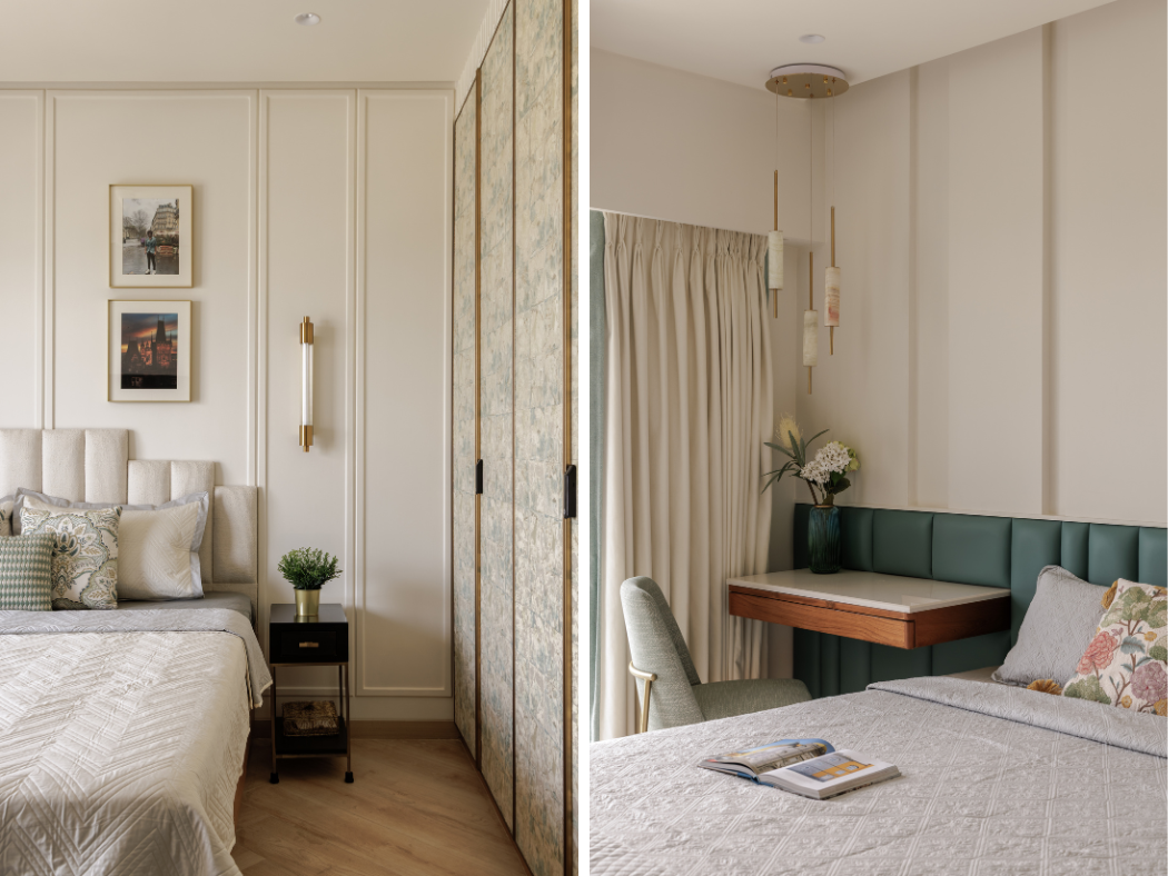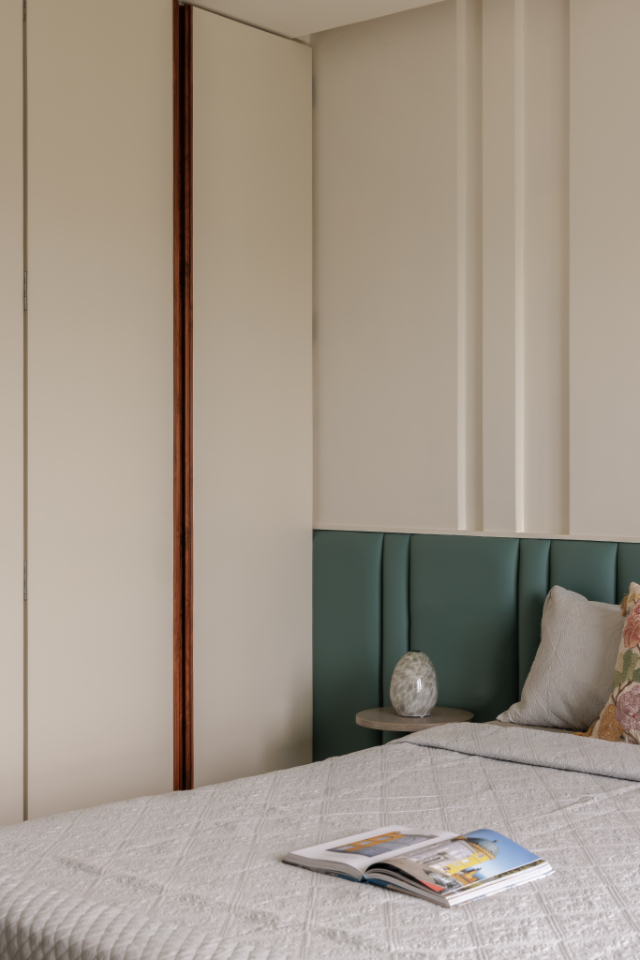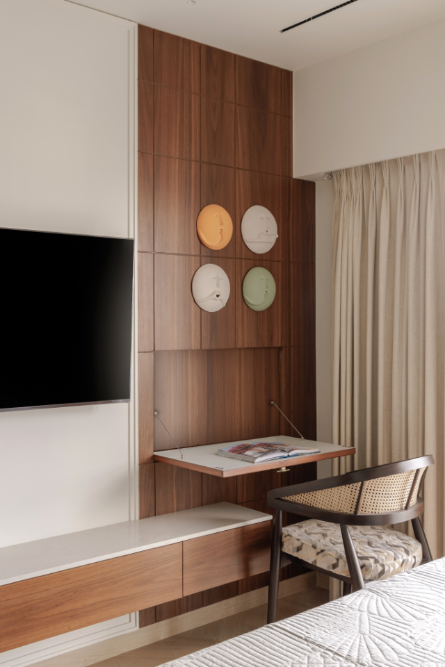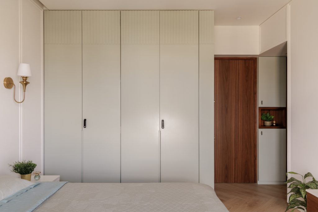Despite being the smallest room in the home, the guest room feels universally appealing. Light-toned wardrobes with customised wooden handles and generous circulation around the bed ensure comfort for both residents and visitors. The study table doubles as a luggage platform—an efficient detail that preserves floor area while enhancing usability.