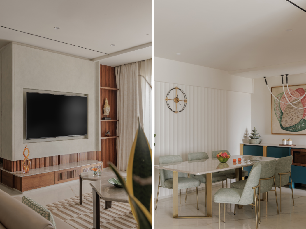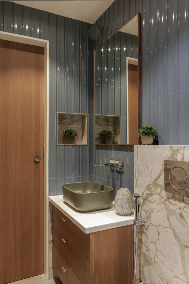 Photograph Courtesy: Wabi-Sabi StudioProducts / Materials / Vendors: Finishes – Tiles, Veneer, PU, paint, fabric etc / Wallcovering / Cladding – MDF + PU, Wallpaper, Veneer / Lighting – Lafit for architectural / Doors and Partitions – Block board + MDF + PU / Sanitaryware – Kohler / Windows – Aluminum / Furniture – Custom made by Teak & Linen, mixed material – brass, wood, marble, fabric / Flooring – Vitrified tiles – LTC Surfaces / Kitchen – Quartz Stone Counter Top – Specta Surfaces / Paint – Asian Paints / Artefacts – Artworks from Art by Prityaanshi, Blanc.White, Claymen, decor from address home, rearrange home, pure home and living, misc curated