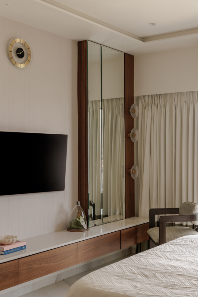 The client’s wife’s favourite colour—green—appears in the entrance wardrobe through a subtly detailed wallpaper applied over glass. A full-length mirror not only serves practical needs but also reflects the span of the home, amplifying light and depth.