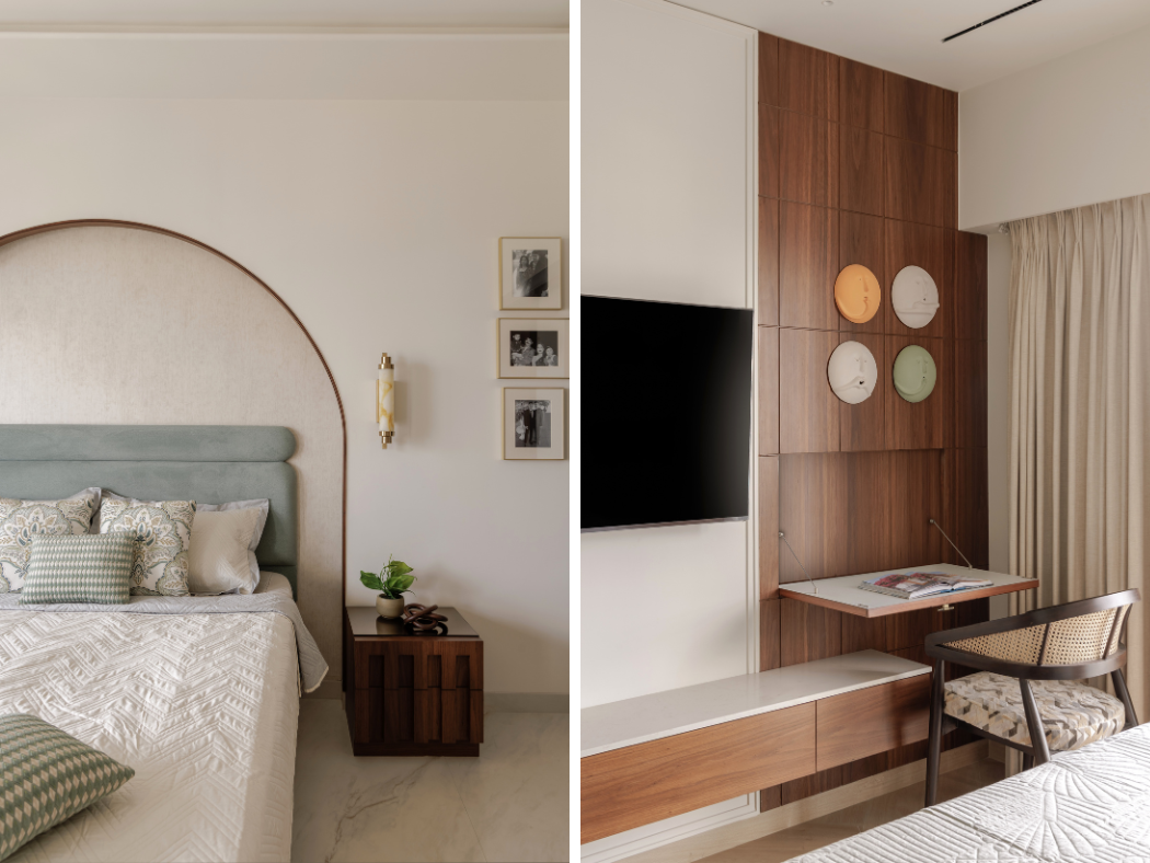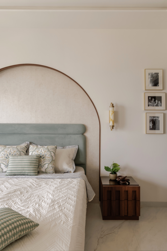 The master bedroom is where the clients embraced trends with enthusiasm and togetherness. The dramatic arched panelling behind the bed serves as both a sculptural backdrop and a source of gentle mood lighting.