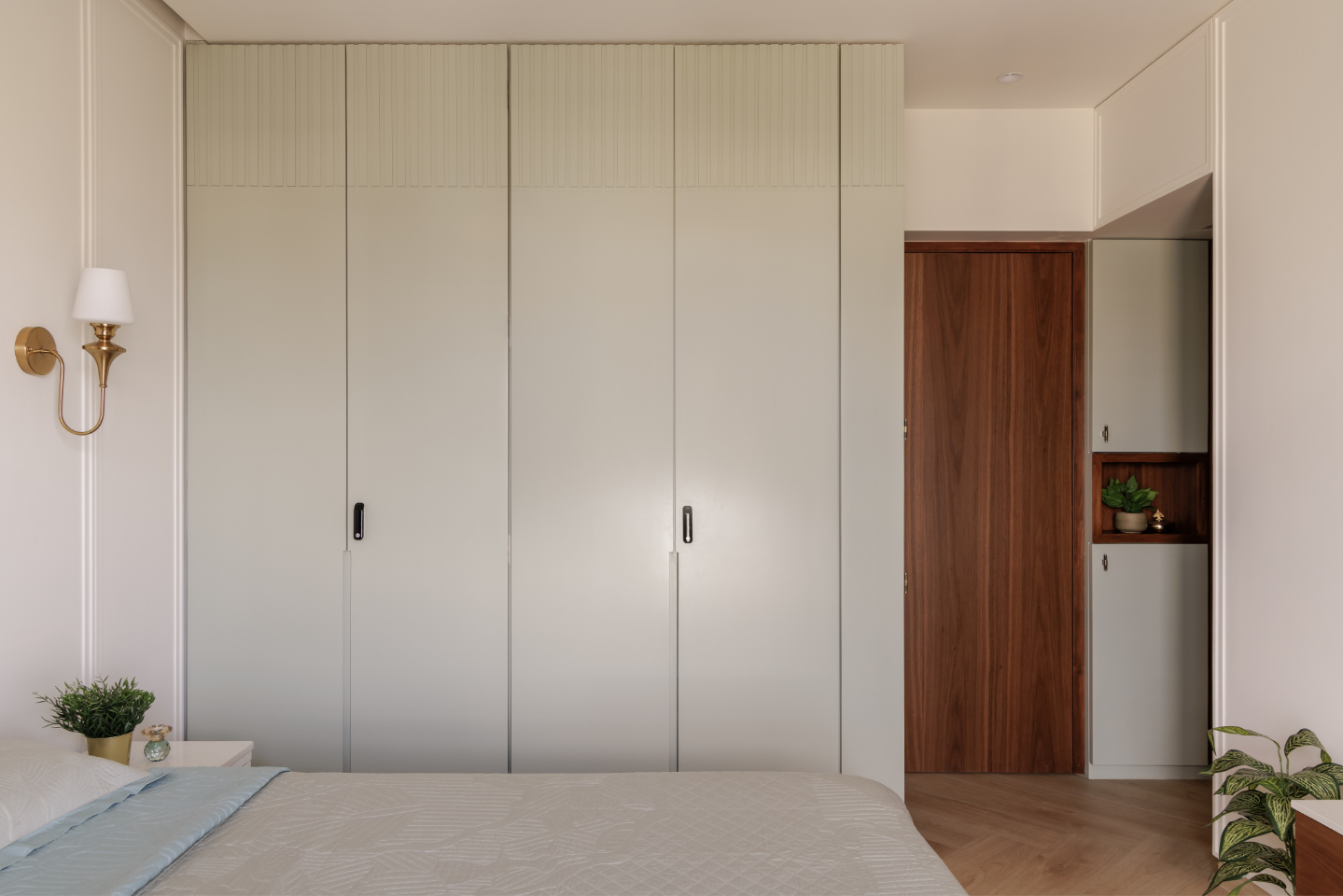 This bedroom reflects the younger son’s modern European aesthetic through rich textures, brass hardware, refined panelling, and layered lighting. A bespoke sculptural metal artwork adds a bold statement, while the wallpapered wardrobe introduces depth and softness.