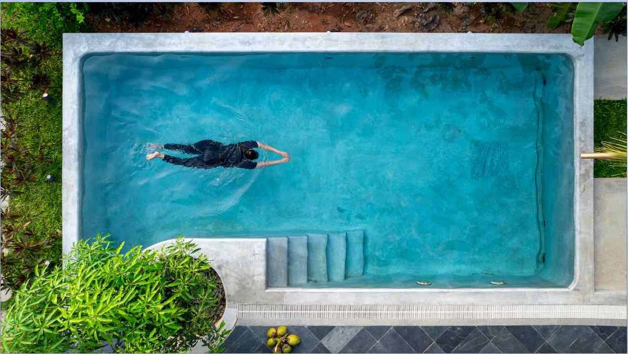 The designers treat the pool with a grey tone of IPS cement finish that enables it to reflect the hues of the sky and respond to the breeze—quietly echoing the surrounding environment. Beyond its role as a leisure feature, they reuse the water from the pool to irrigate the plantation, underscoring a sustainable, closed-loop relationship between home and habitat.