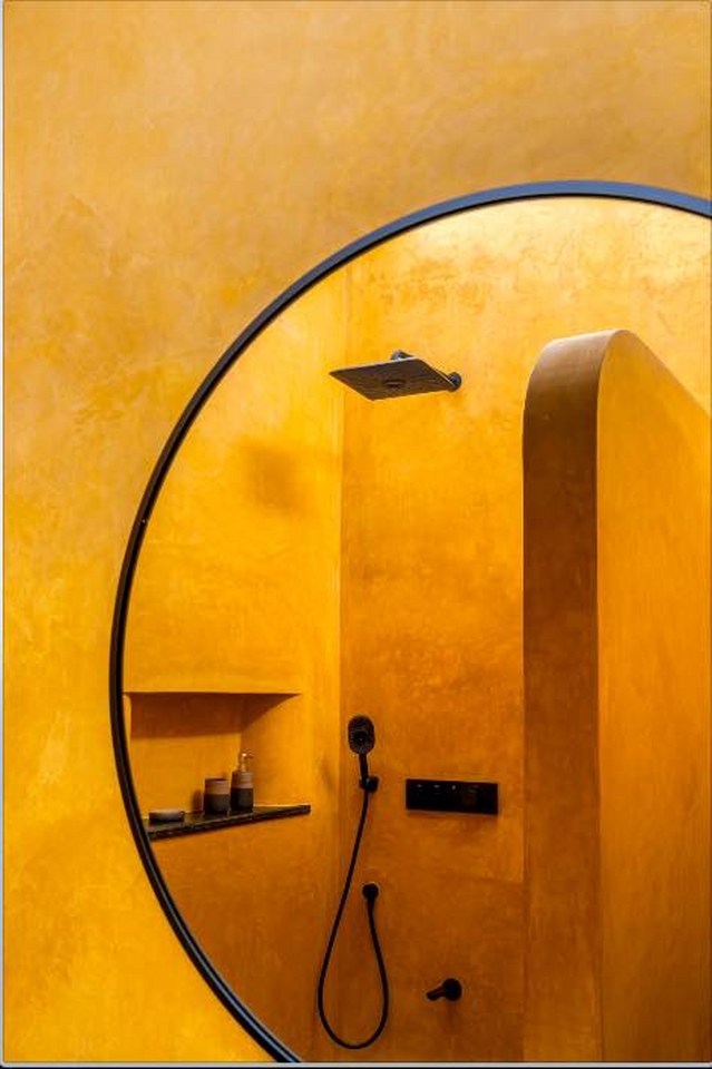 The bathroom walls are finished with IPS-treated lime plaster, chosen for its breathability, durability, and low environmental impact. Together, these materials anchor the farmhouse in its context while reinforcing a quiet, lasting sustainability.