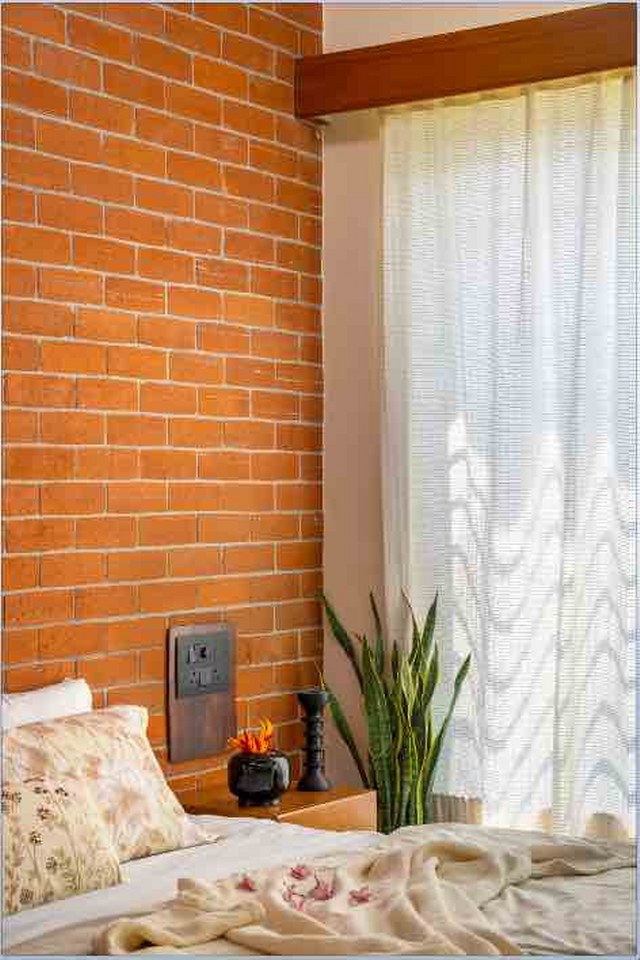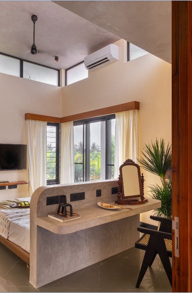 Materiality plays a central role in shaping the farmhouse’s identity. Exposed brick walls bring texture and tactility, while textured concrete elements lend a modern yet unpretentious strength. Flooring in cool Kota stone offers a grounded, barefoot luxury, complementing the robust Sadharhalli stone. The designers selected each material not only for its visual and tactile appeal but also for its natural responsiveness, ensuring the house stays thermally comfortable across seasons.