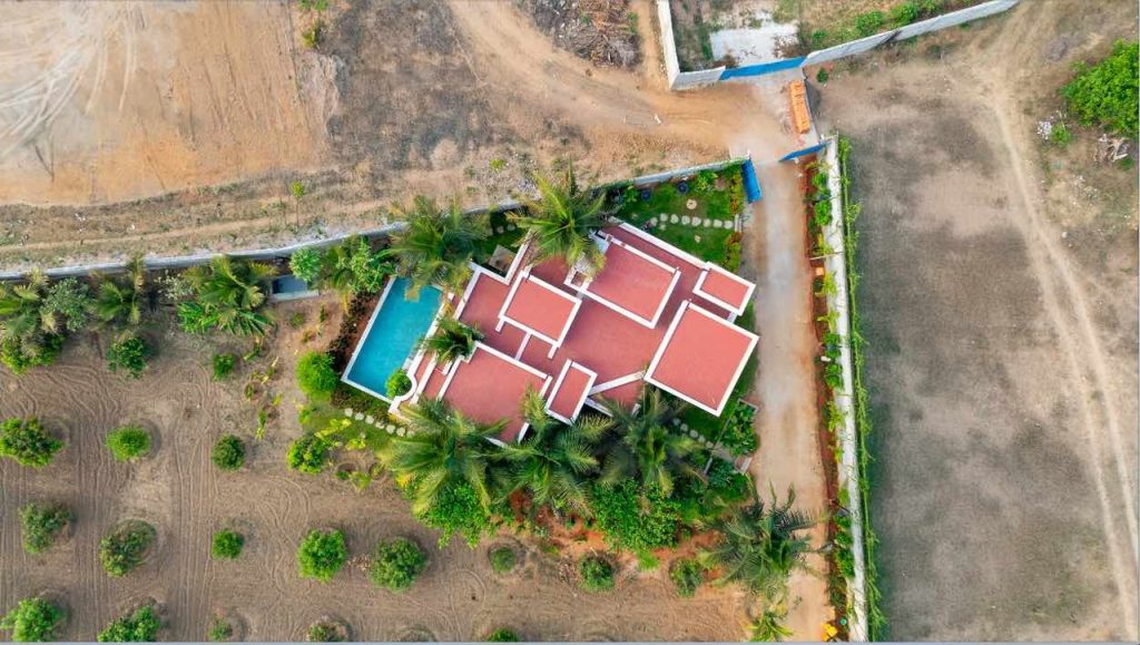 Tucked into a corner of a lush 2 acre plantation off the Kanchipuram highway, this farmhouse is a quiet ode to sustainability and serenity. Surrounded by thriving groves of coconut, mango, and orange trees, the site offered a natural canvas for a home that would dissolve gently into its surroundings of rural landscapes—grounded in place and poetic in spirit.