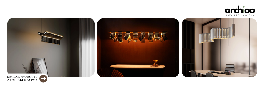 Above the desk, a pendant light merges wood and metal in sleek harmony, its linear form casting focused illumination for detailed work while contributing to the overall aesthetic dialogue. Grooved wooden cabinetry hugs the wall below the desk, providing storage that maintains the space’s clean lines while adding textural richness through repetitive vertical elements.