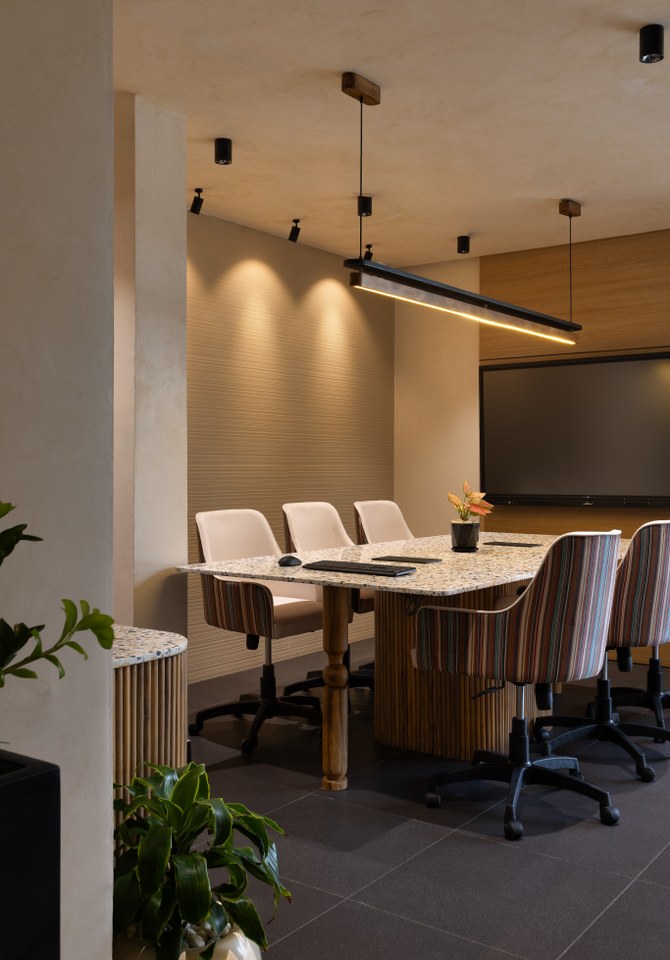 The central conference table continues the terrazzo and wood dialogue established throughout the studio, surrounded by six chairs that maintain consistency of earthy materials with other seating throughout the space.
