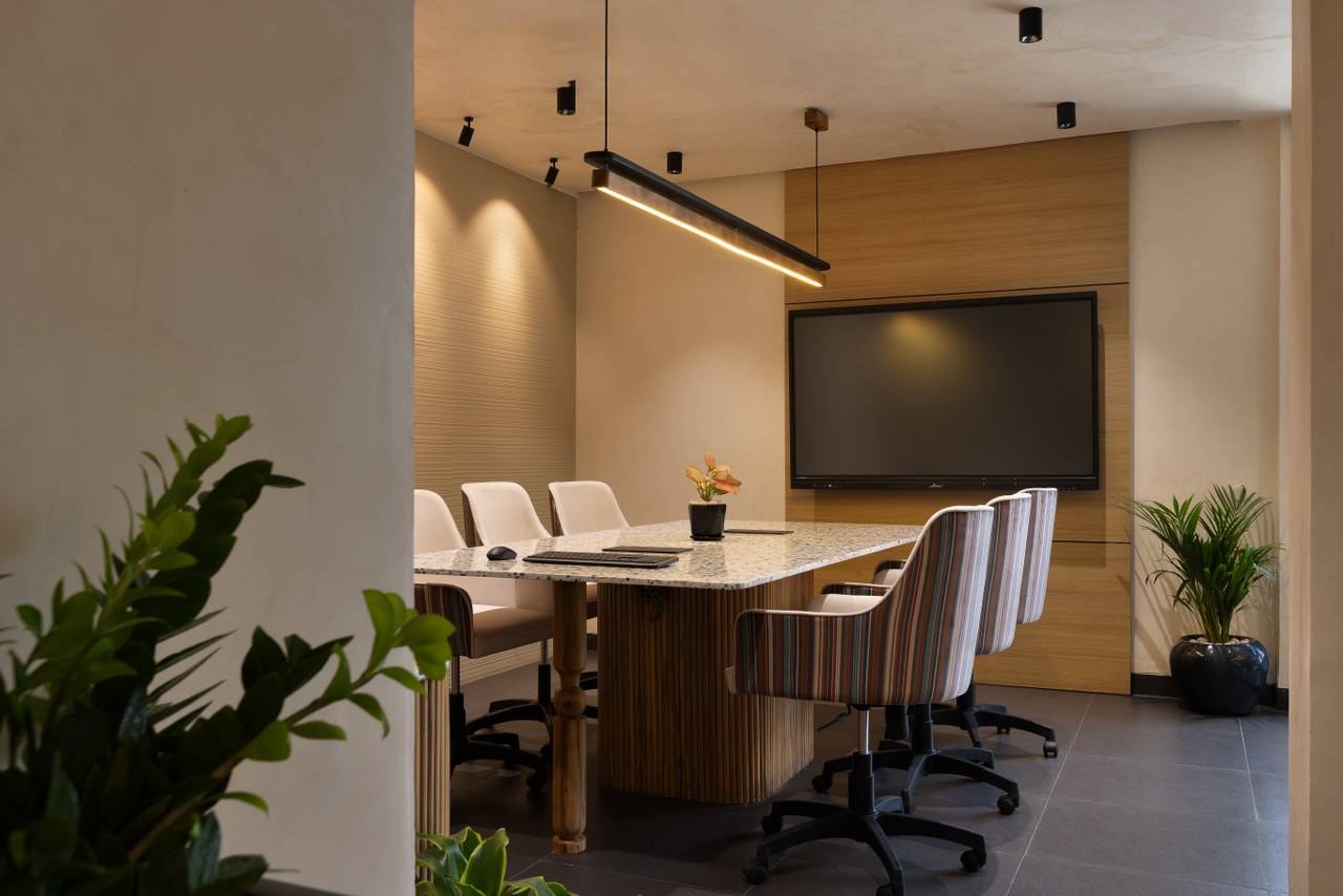A large television awaits presentations and collaborative reviews, while pendant lighting similar to that found in Mrudula’s office provides task-appropriate illumination for detailed discussions and decision-making sessions.