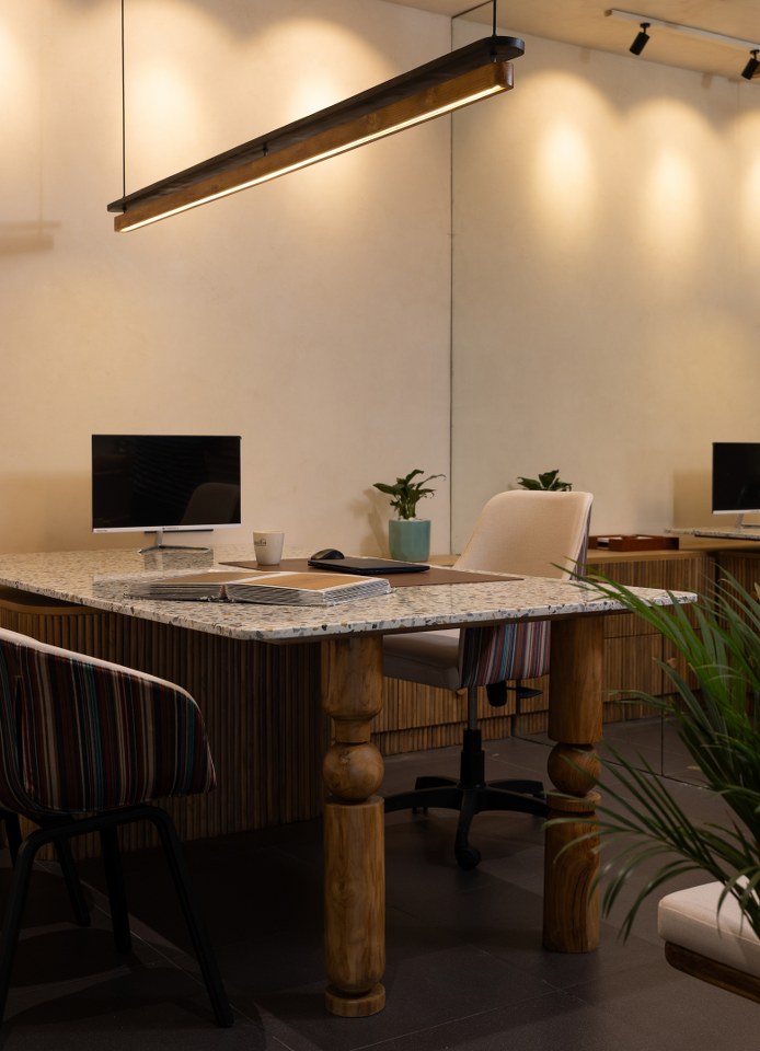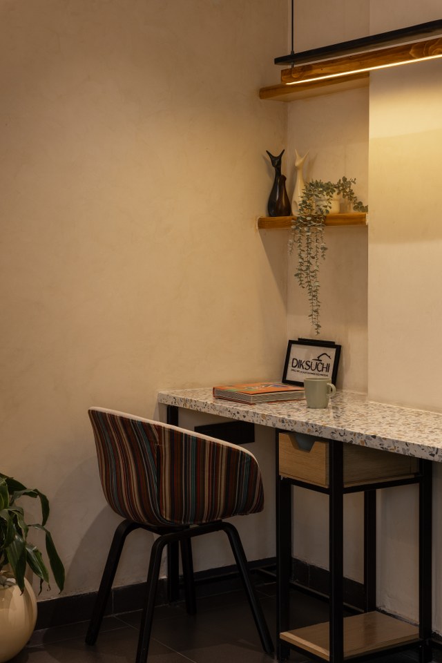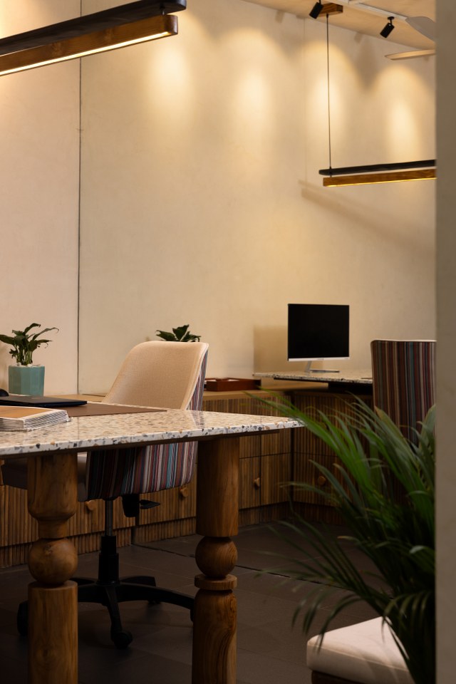 Mrudula’s office reveals itself through these transparent boundaries that preserve privacy while maintaining connection to the studio’s pulse. It is not a corner of authority but her cocoon of creativity. Her desk aligns with the left wall, its terrazzo top supported by sculpted wooden legs that appear to dance beneath the substantial surface.