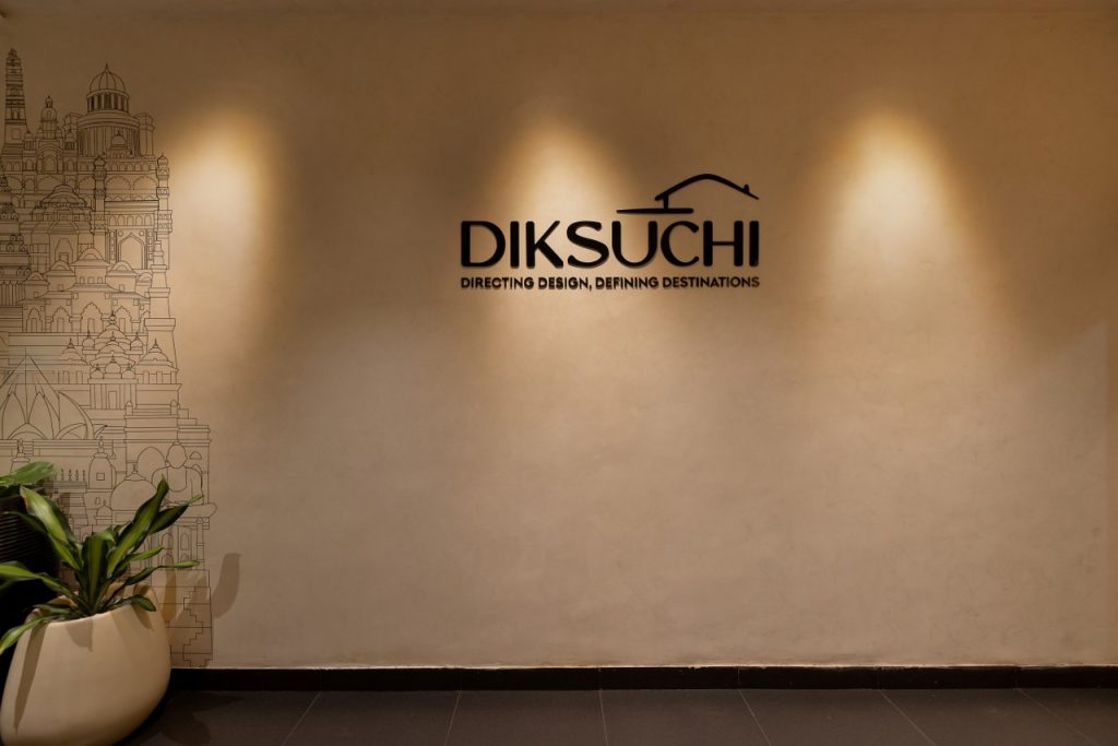A weathered wall bearing a copper- green patina greets visitors at the threshold. The Diksuchi Studio logo rests with pride on this textured backdrop like a signature. A glass door dissolves the barrier between public corridor and private sanctuary, while a warm wooden step marks the entry into creative terrain.