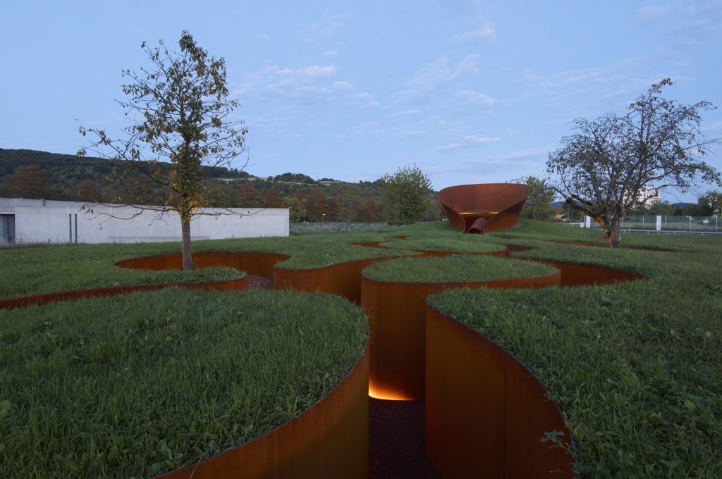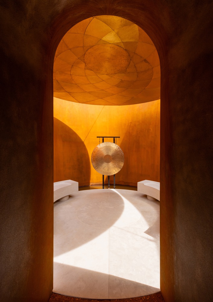 The soundscape, integrated through concealed acoustic recesses, accompanies the visitor through the pathway and culminates in a circular contemplation chamber. Within this organically shaped space, a rainwater basin, two semicircular stone benches, and a central gong create a meditative atmosphere. Light filters through an aperture in the ceiling, reflecting from a hand-hammered brass mandala crafted in India, casting delicate patterns across the space.