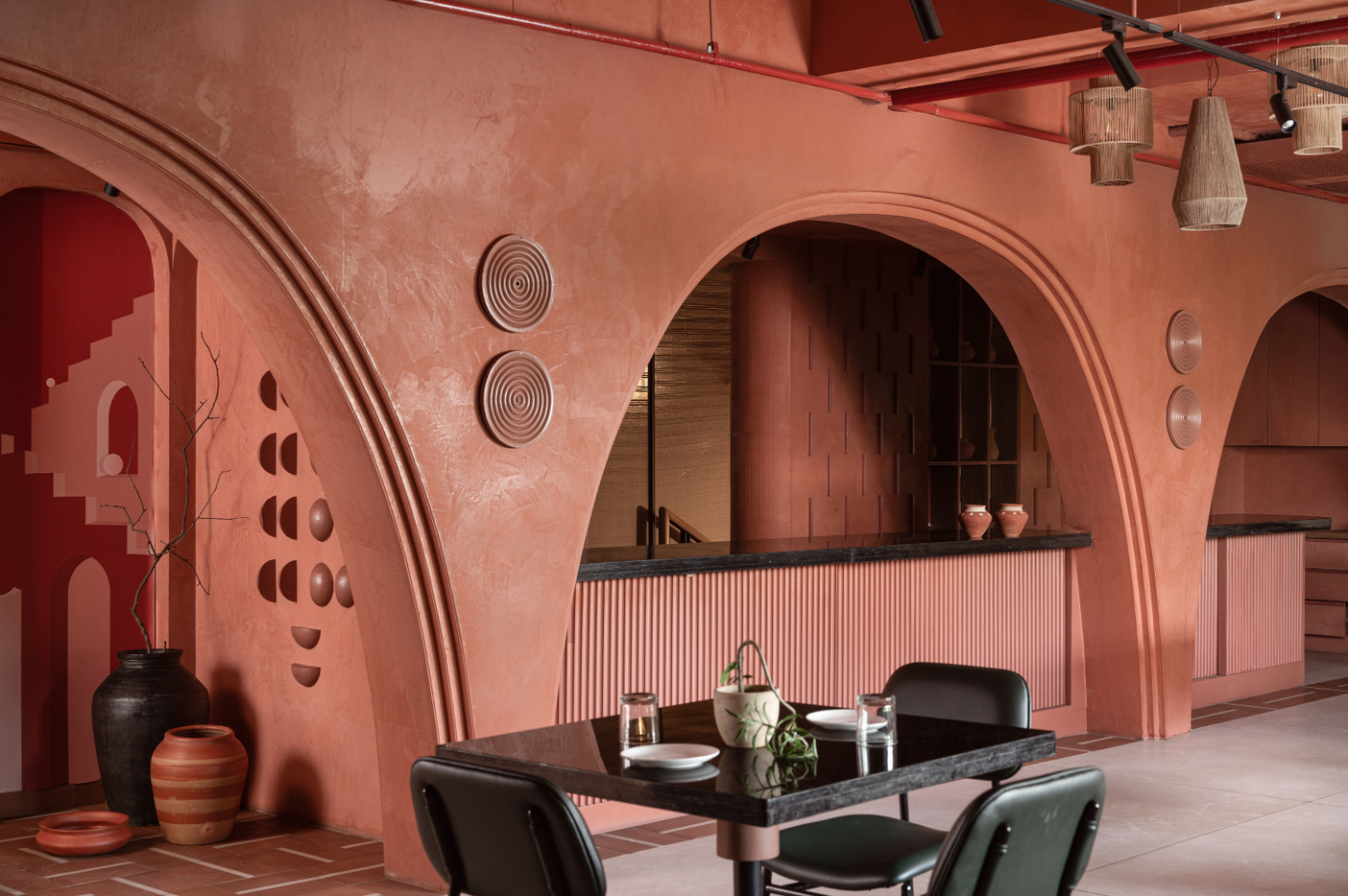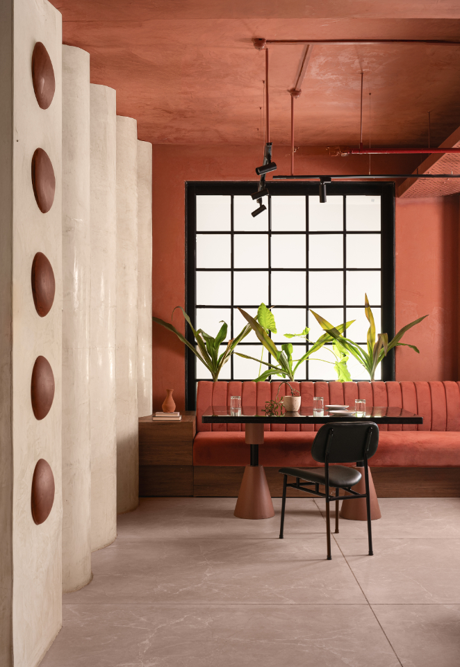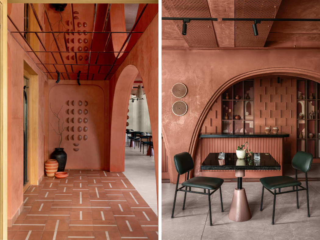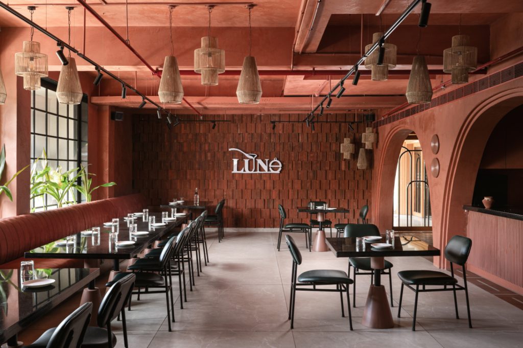 The terracotta walls and ceiling were paired with earthy handmade ceramic floor tiles, a 22-foot black granite bar with fluted MDF patterns, and an undulating bent plywood wall. Sustainable elements include jute lamps, clay bricks, and creative use of brick and reuse of plywood waste in panelling. Unique, handmade terracotta artefacts and wall art, crafted specifically for Lune, add visual interest and a layer of depth to the space.