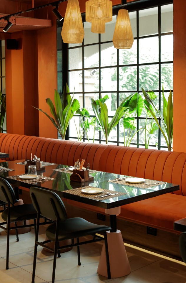 Two distinct seating zones, carefully crafted to accommodate 40 patrons, unfold like a canvas of possibilities. A sinuous, concrete wall sweeps across the space, separating the two seating zones while creating a sense of fluid dynamism. On one side, a café-style area beckons with its chairs and tables; on the other, a luxurious lounge invites relaxation with its plush sofa seating. Beautifully crafted by Isha Khosla the ergonomic metal frame chairs boast angled backs to ensure comfort and support. Paired with granite-topped tables featuring metal pipes and plywood legs, the chairs strike a perfect balance between form and function. The show-stopping 38-foot sofa, stretching from wall to wall, is a masterful blend of plywood, metal, and plush suede fabric, inviting relaxation and repose.